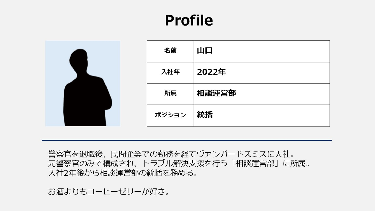 今回は警察官勤務を終えたのち、施工会社や警備会社での勤務を経てヴァンガードスミスに入社した相談運営部 統括/山口さんにお話を伺いました。