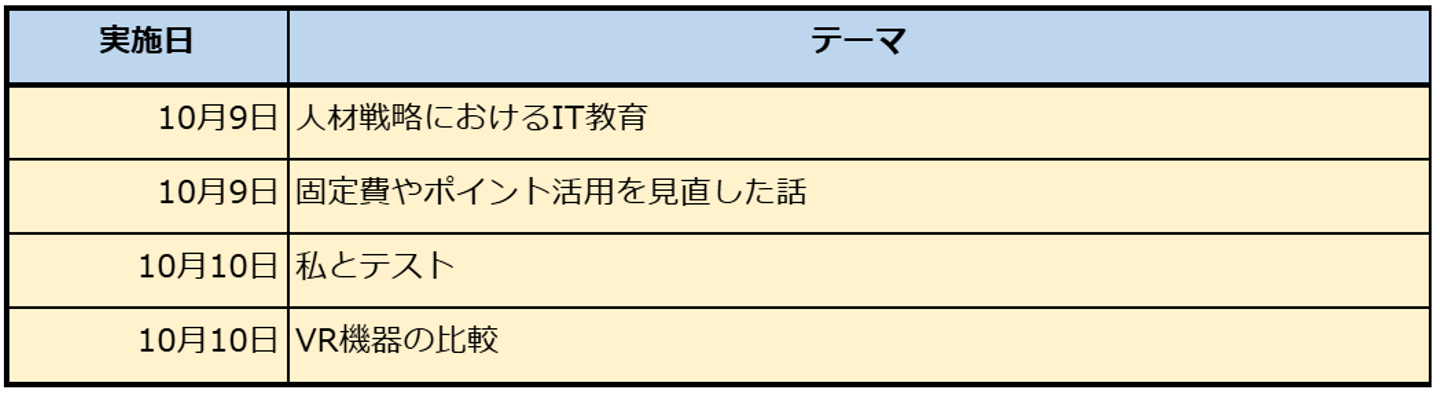 2週目には、フリーテーマでLTを実施。仕事論でも趣味話でも、何でも良し。各々自信のあるジャンルを選定して資料を作成し、プレゼンを実施します。
