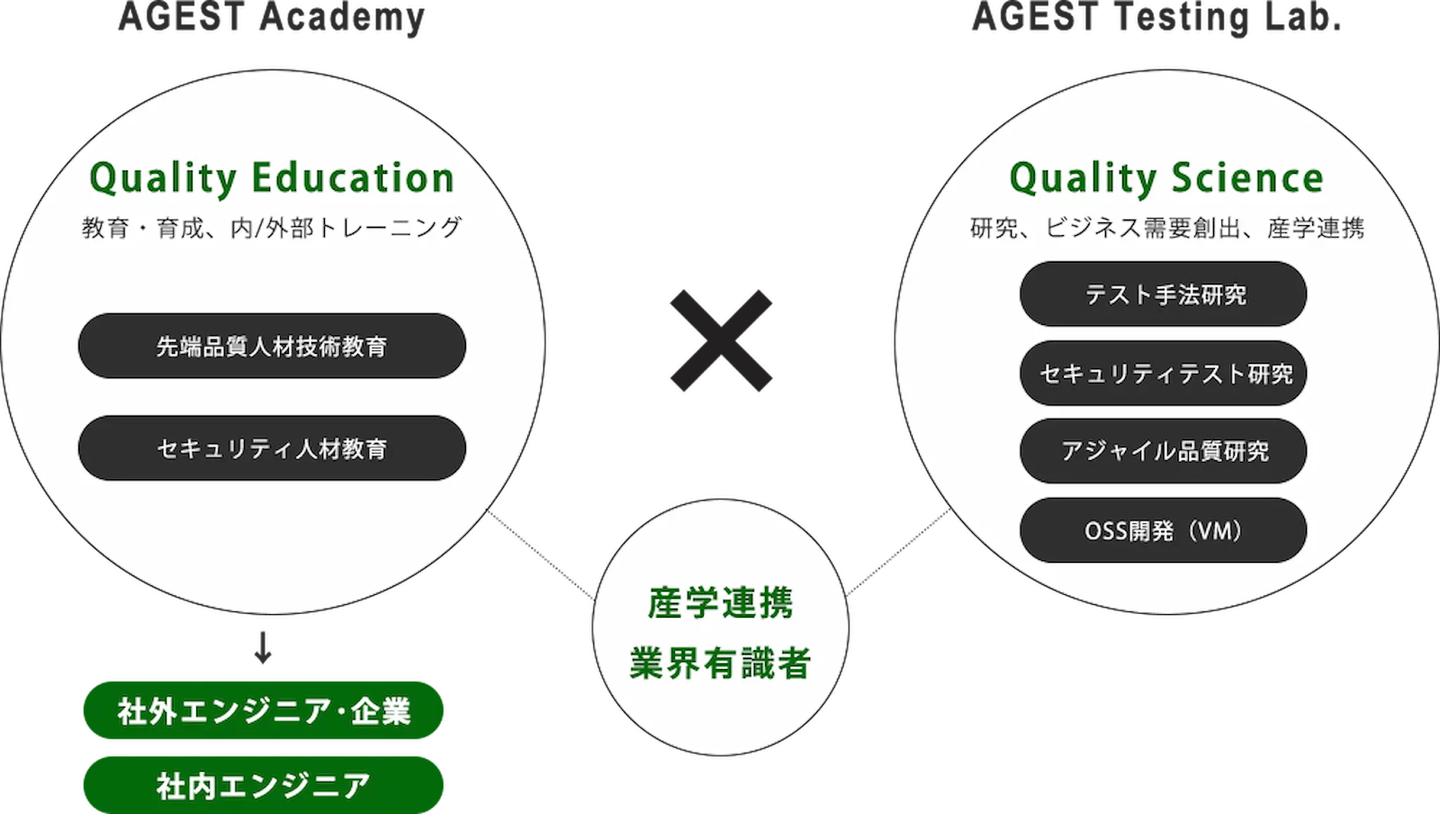 上記両名のほか豊富な知識と経験を持つ「ソフトウェア品質の専門家たち」によって、最新の状況をアップデートしています。、また当社のR&D機関である「AGEST Testing Lab.」における各領域の先端研究結果や手法をAGEST Academyのカリキュラムにも汎用し、エンジニア知見やノウハウのボトムアップに常時注力しています。