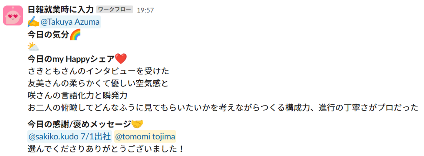 👆Co-Growthでは、毎日「今日の感謝&happy」をシェアしています。これは、インタビュー当日の拓さんの投稿。拓さんの言葉に、とても嬉しくなりました!