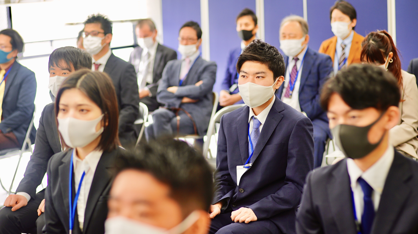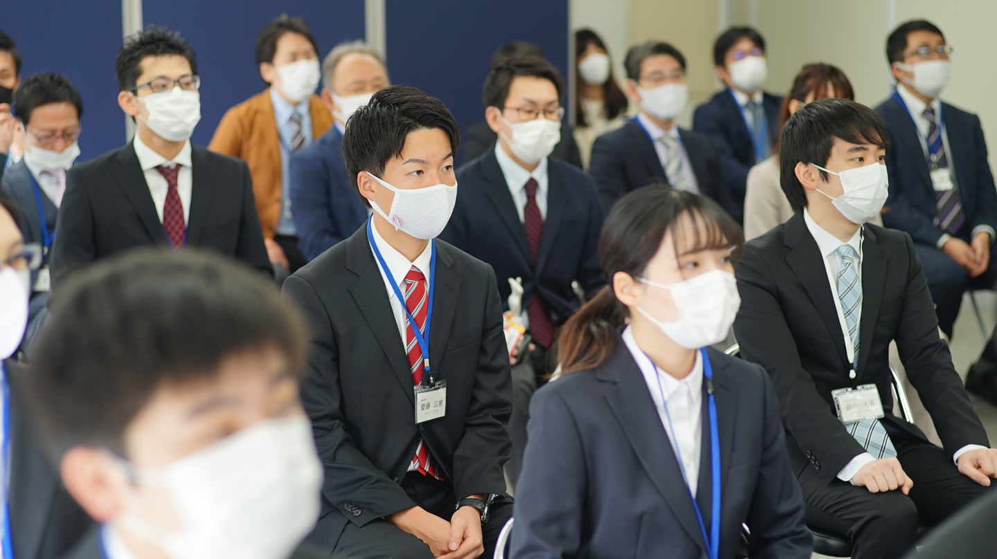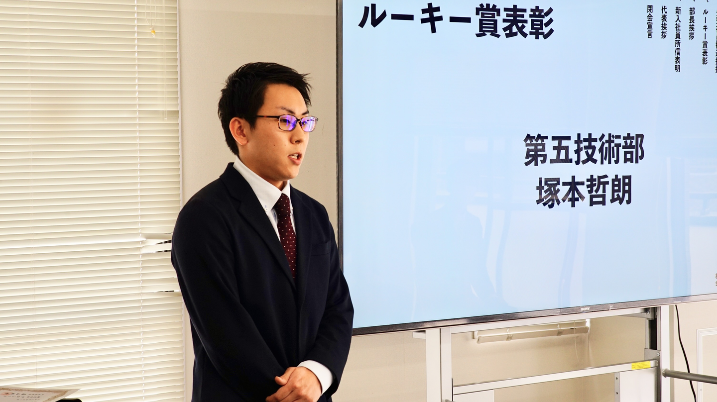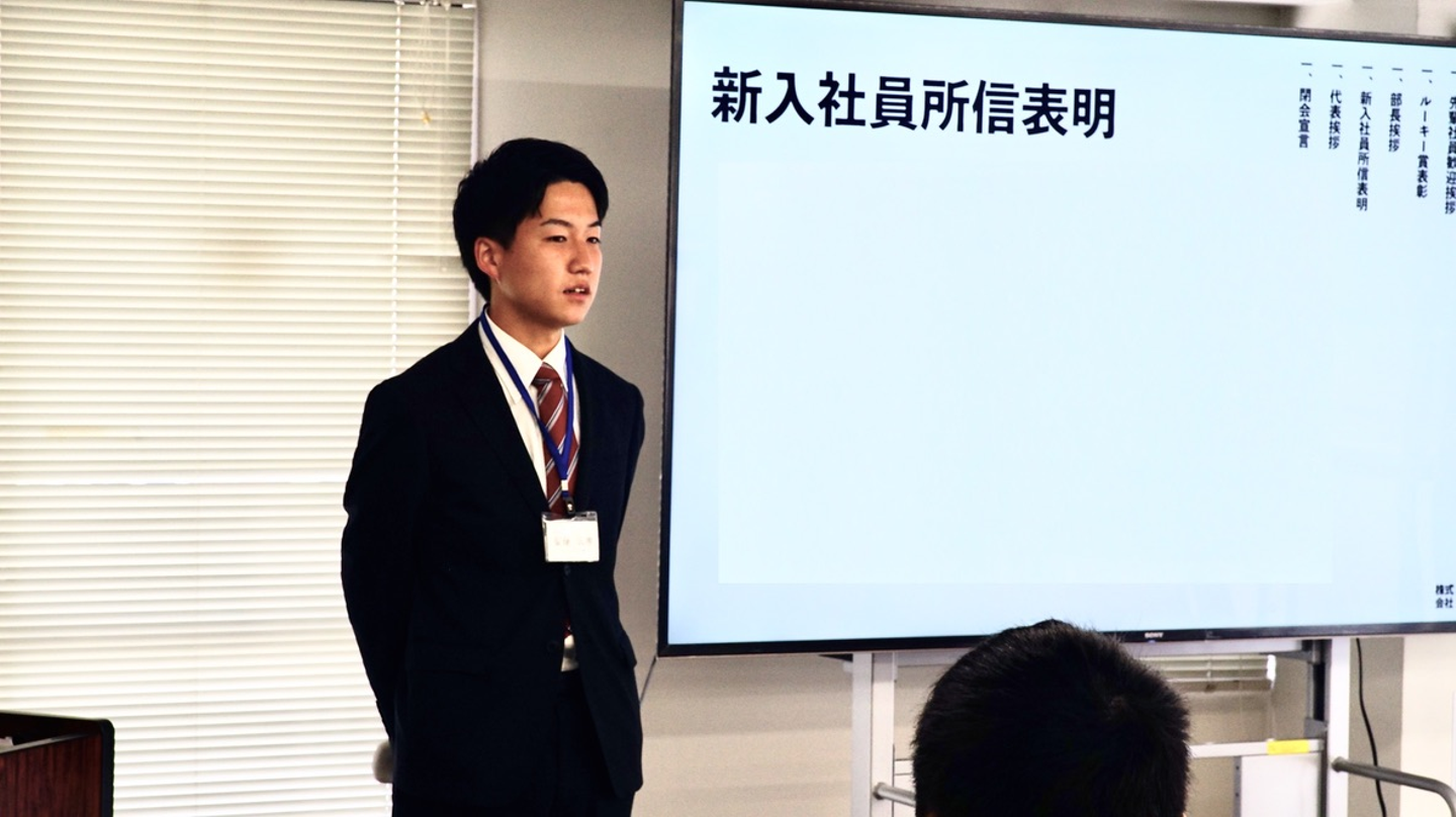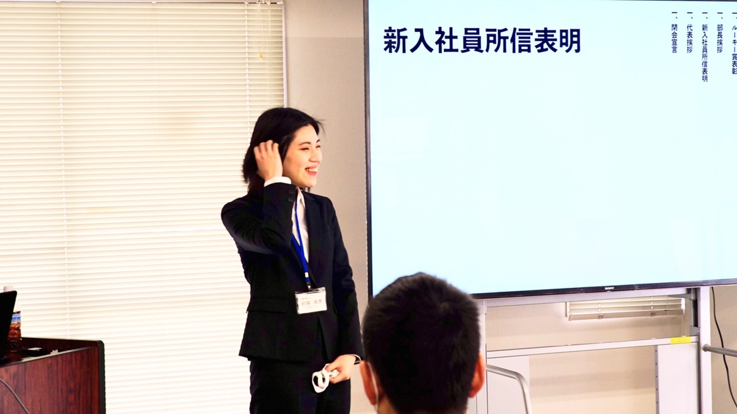 スピーチでは、自分の1年を振り返って、新入社員に諦めないことを伝えていました!