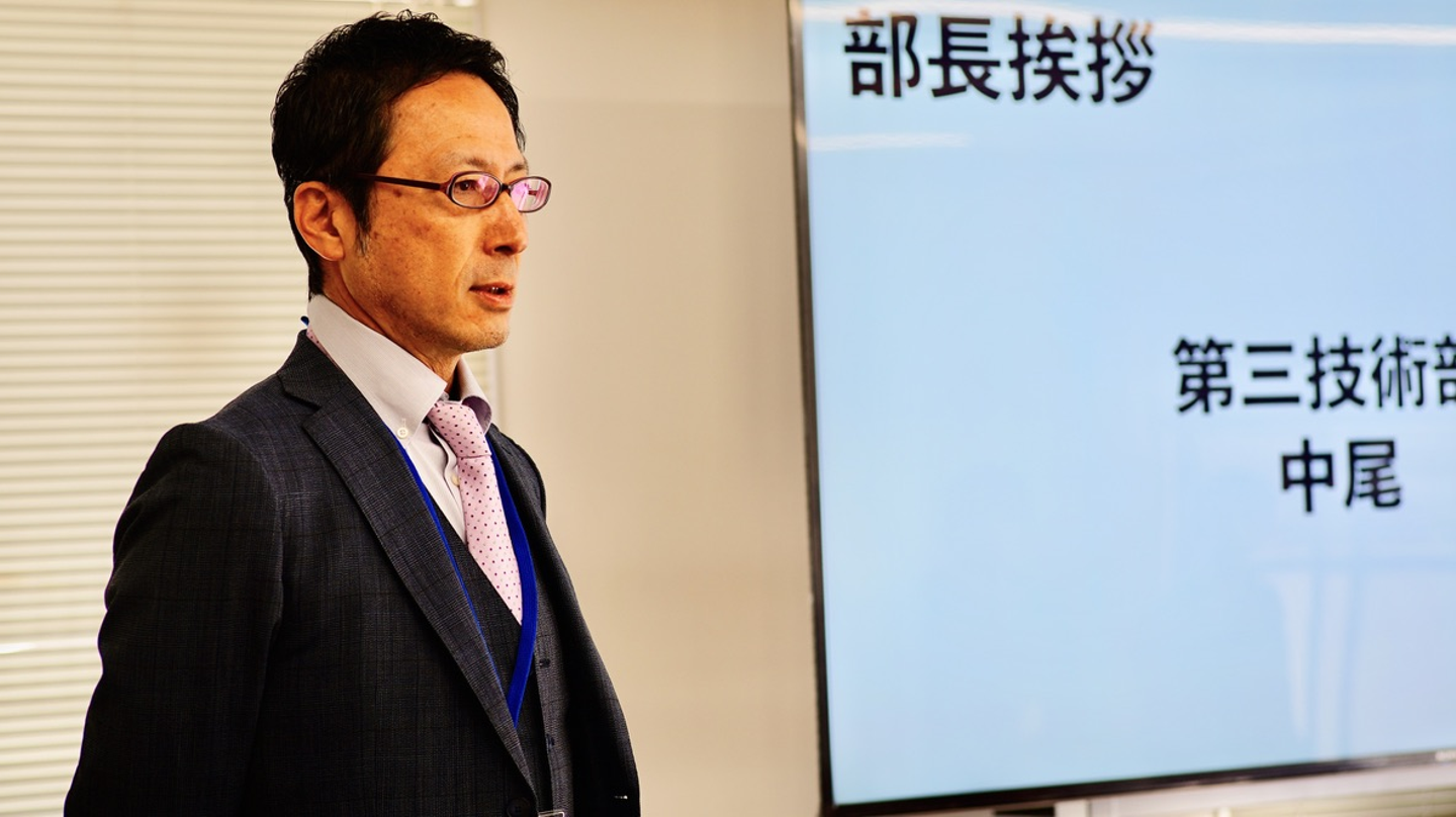 第3技術部の中尾部長の挨拶。あれ、いつもよりイケメンに写ってますね〜!