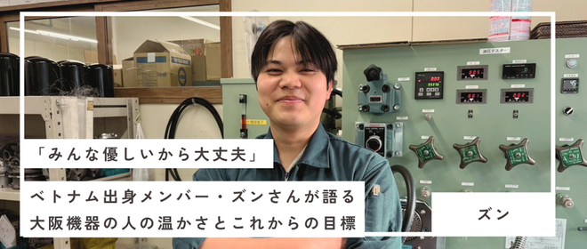 皆さんこんにちは!株式会社大阪機器工作所の広報担当の青木です!今回は社員インタビューとして、入社2年目のベトナム出身メンバーのズンさんにお話を伺いました。家族を支えたいという強い想いを胸に、異国の地で働き続けてきたズンさん。現在は大阪機器で技術研修生として、洗浄や組み立て、テスト業務に携わっています。「みんな優しいから大丈夫です」インタビュー中、何度もそう語るズンさんの言葉からは、この会社で築かれた信頼関係が伝わってきました。20歳で来日。家族を支えるための挑戦青木:まずはズンさんご自身について教えてください。日本に来て何年になりますか?ズン:私が日本に来たのは2018年4月で、2026...