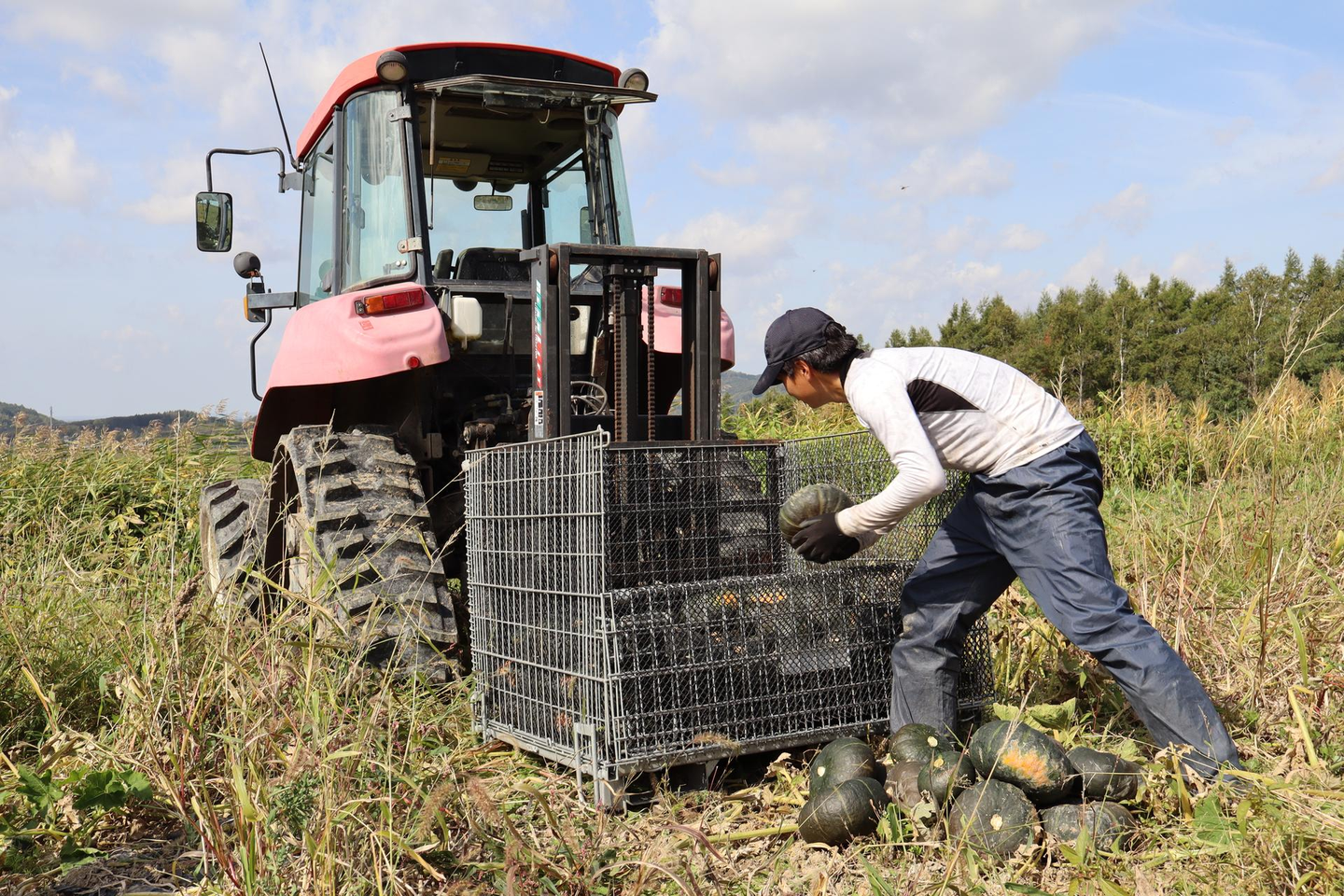 特にカボチャの収穫作業はカボチャ1個の重量が約2㎏前後と「重量野菜」とも言われていることに加え、機械化がほとんど進んでおらず、多くの作業が手作業で行われています。
