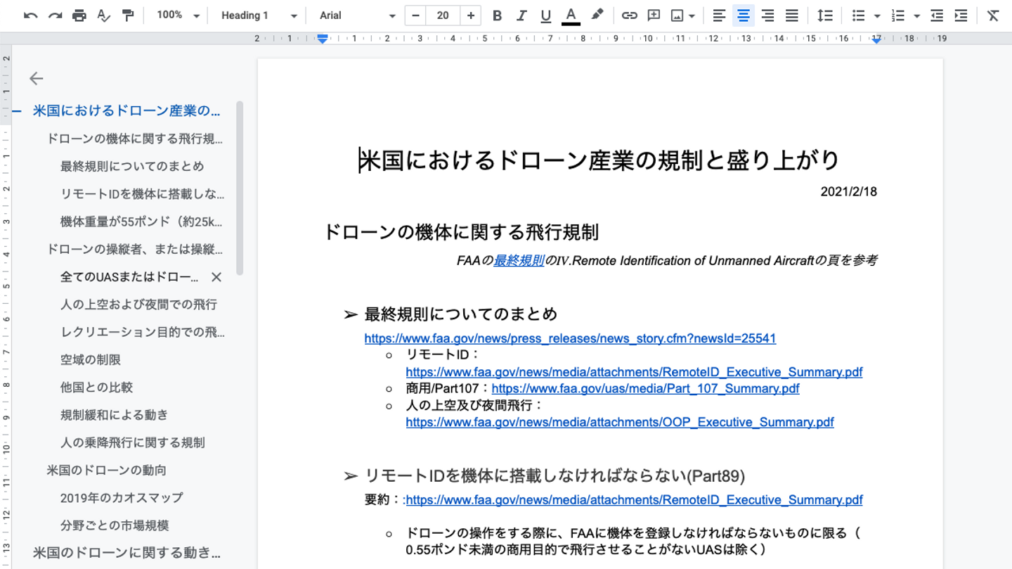 畠山さんが取り組んだ「アメリカのドローンに関する法整備」のレポートの編集時の様子。最終的には70ページ近い膨大な資料になりました。ここから更に要点をまとめ上げて「ドローントレンド白書」として、お客様へお渡しすることが出来ました。
