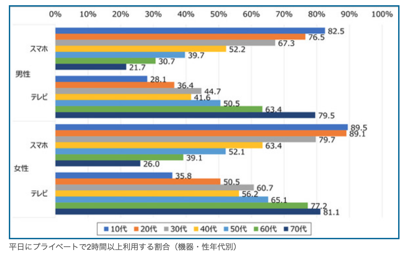 2007年のスマホの登場以来、最近はテレビよりスマホを見る時間が長くなり、40歳以下では半数以上になっているそうです。そして平日に1日2時間以上スマホを見る割合は、男性では40歳以下、女性では50歳以下で半数以上という割合だそうです。