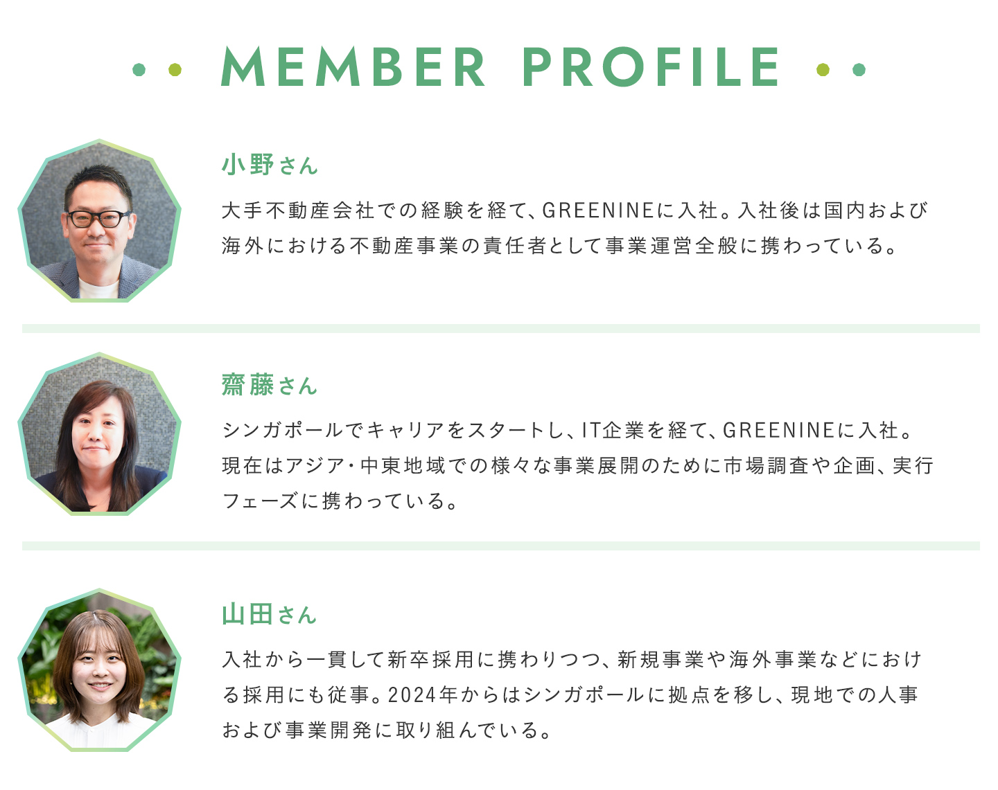 今回は、社員対談企画「GREENINE Cross Talk」の第3弾として、2021年から始まったGREENINEの海外事業に携わる3名に、シンガポール拠点やドバイ拠点での仕事スタイルや海外事業ならではのエピソードについて語ってもらいました。