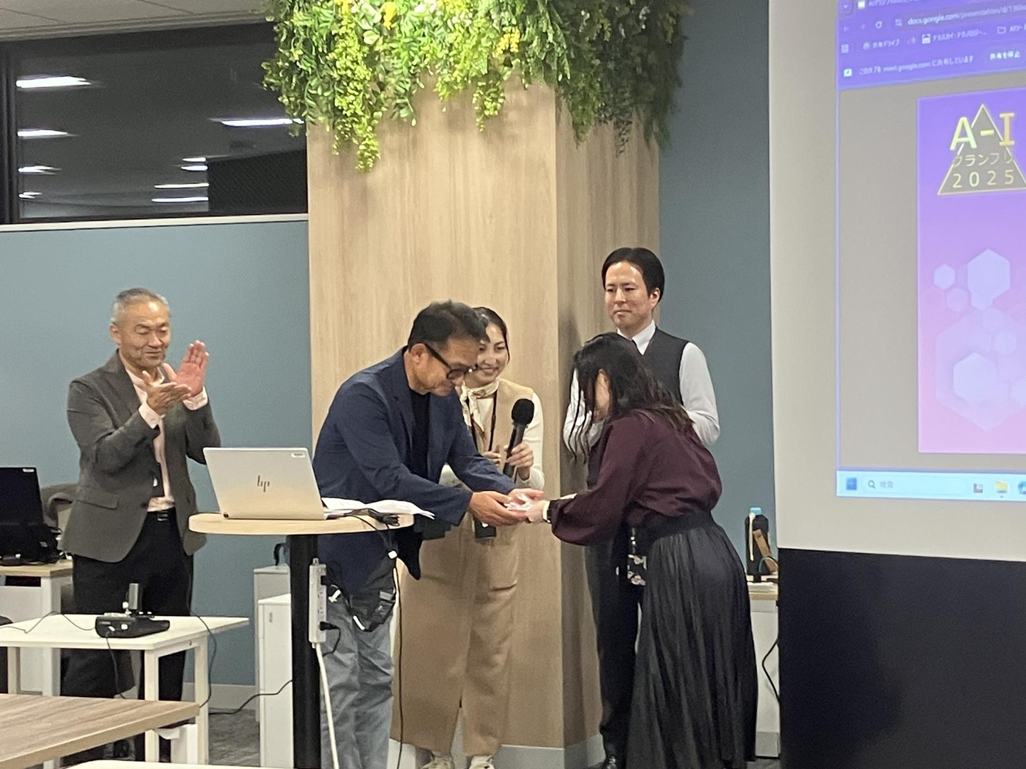 特別審査員の皆さんから「甲乙つけ難し」との声が目立つ中、投票が終わるとすぐに優勝者は会長の宮田さん、審査員特別賞は社長の荒谷さんから発表に移りました。各チームに副賞などの授与があり、大盛況なままAIグランプリは閉幕となりました。