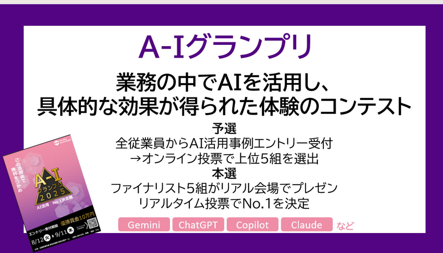 このコンテストでは、日頃の業務でAIを活用し、「こんなに効率化できた!」「こんな良い成果が出た!」といった事例を、全社員にシェアすることをテーマに、職種・年次を問わず多くの社員からの自薦によるエントリーを受け付けました。