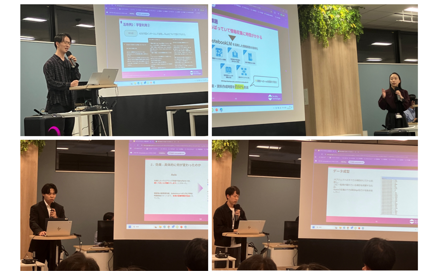 10月に開催された本選には、5組のファイナリストが登壇。特別審査員として現地会場には全役員も揃いました。オンラインでの視聴者含めると150名超が見守る中、ファイナリストが順番にプレゼンテーションを行い、自身のAI活用事例を披露しました。