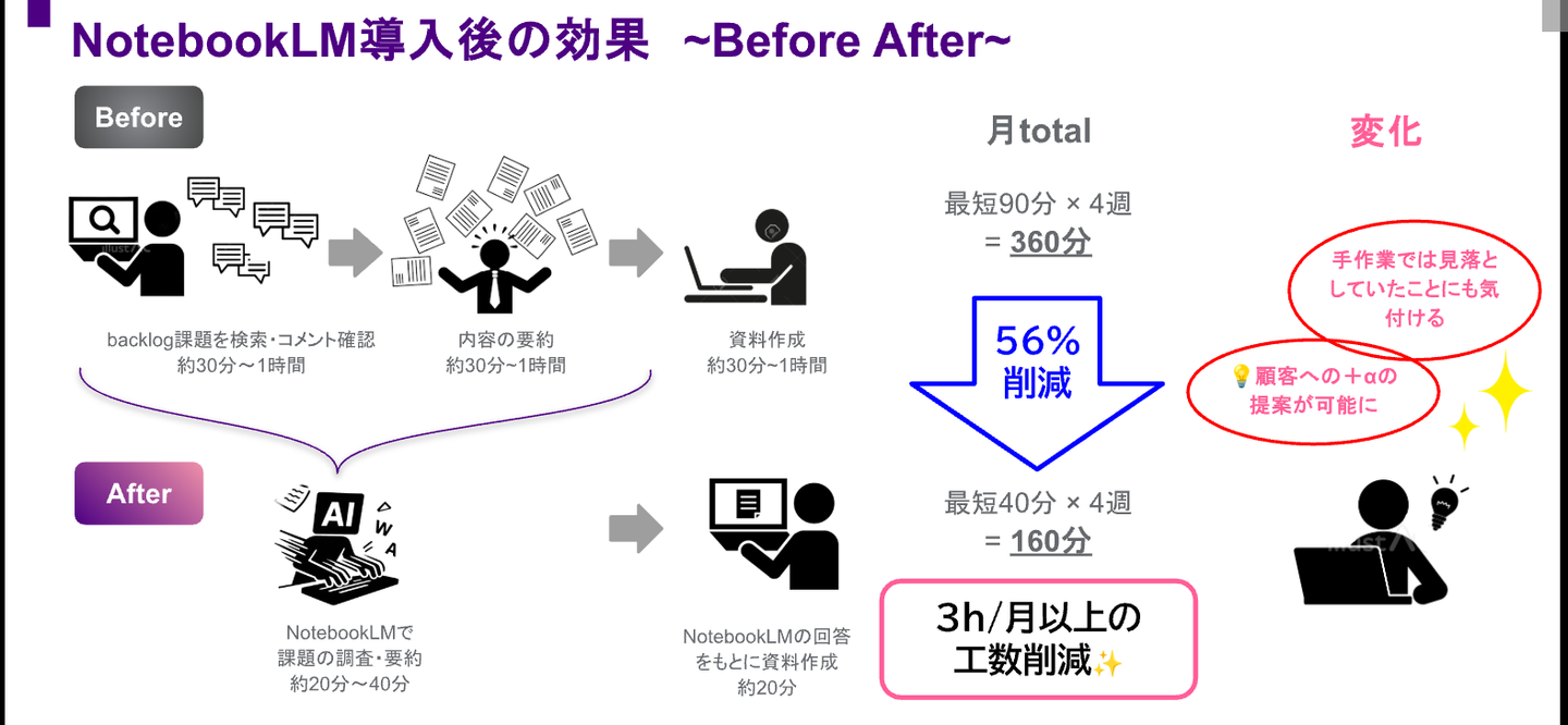 定例会準備における準備を課題として、散らばっている情報について、「NotebookLM」を活用することで情報検索の効率化を実現。資料作成時間を50%超削減できた事例を紹介しました。