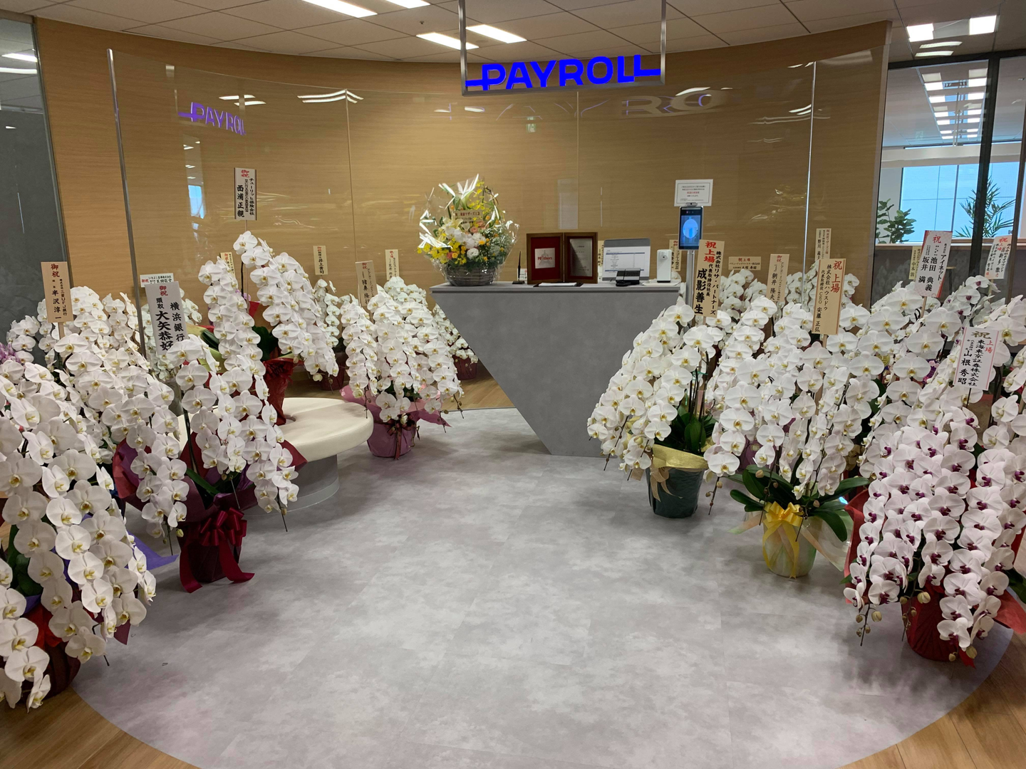 上場日当日は、、受付に並びきらないほどの胡蝶蘭が届きました・・・!✿✿✿