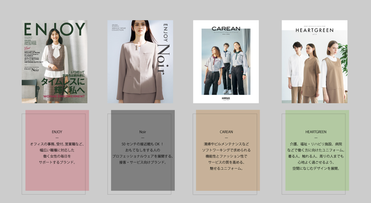 職種は4つのブランドで分けられ、各ブランドでブランディングを確立し、働く人の毎日を支えるユニフォームをつくっています。