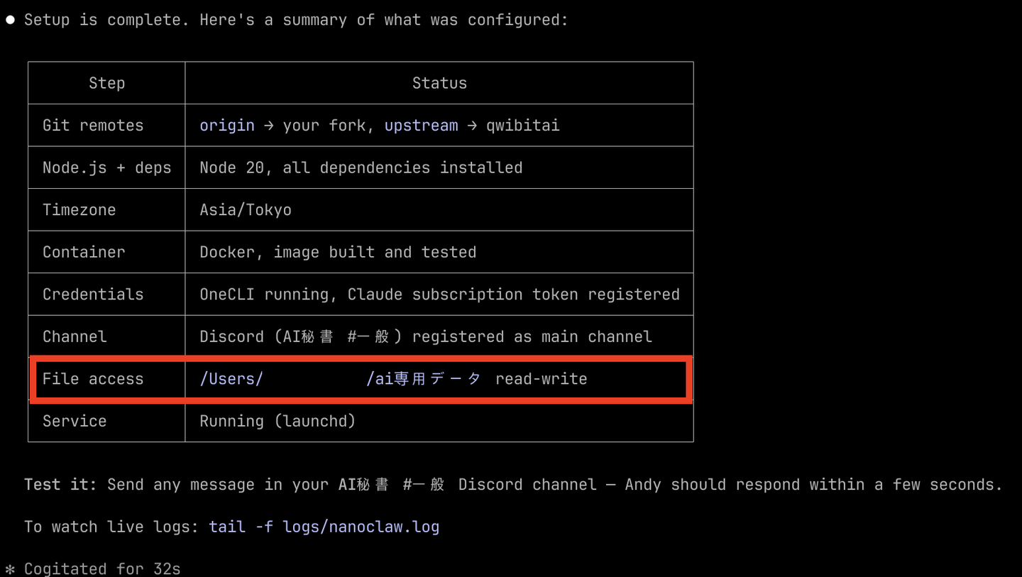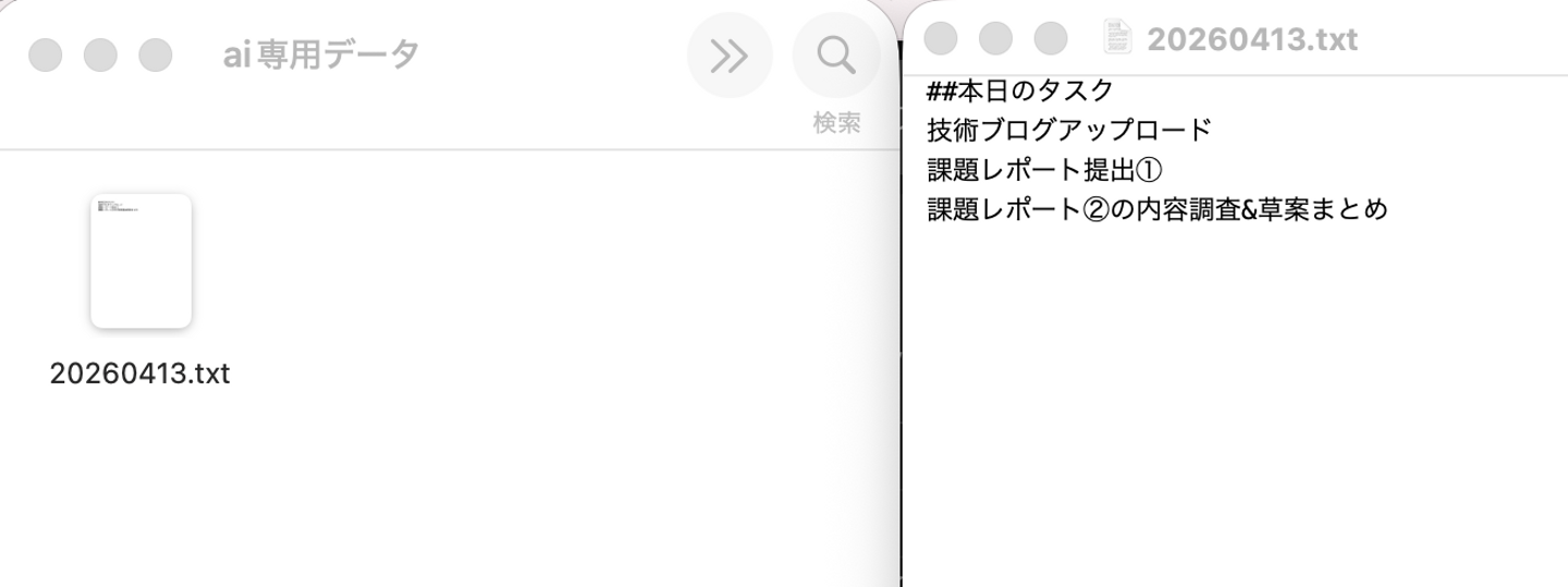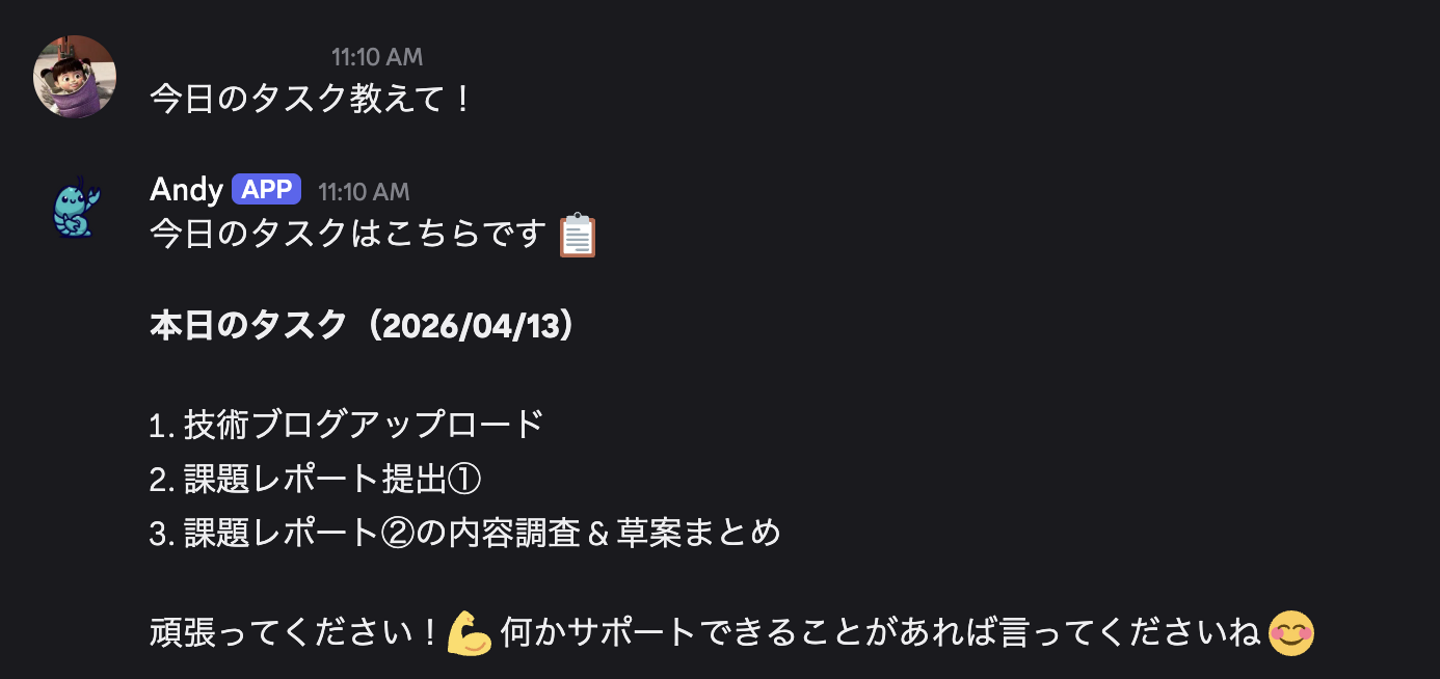 専用フォルダにタスクをテキストで書いておき、Discordで「今日のタスクを教えて」と話しかけたところ、AIが日本語でタスクを読んで返してくれました。(今回の依頼は簡単すぎましたが、ここからAIを育てて行きたいと思います。)