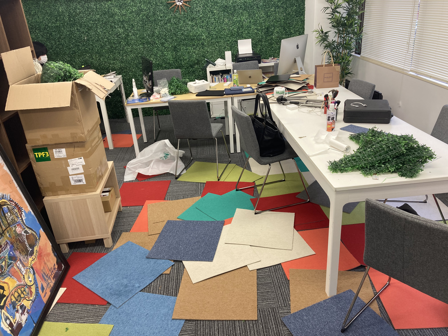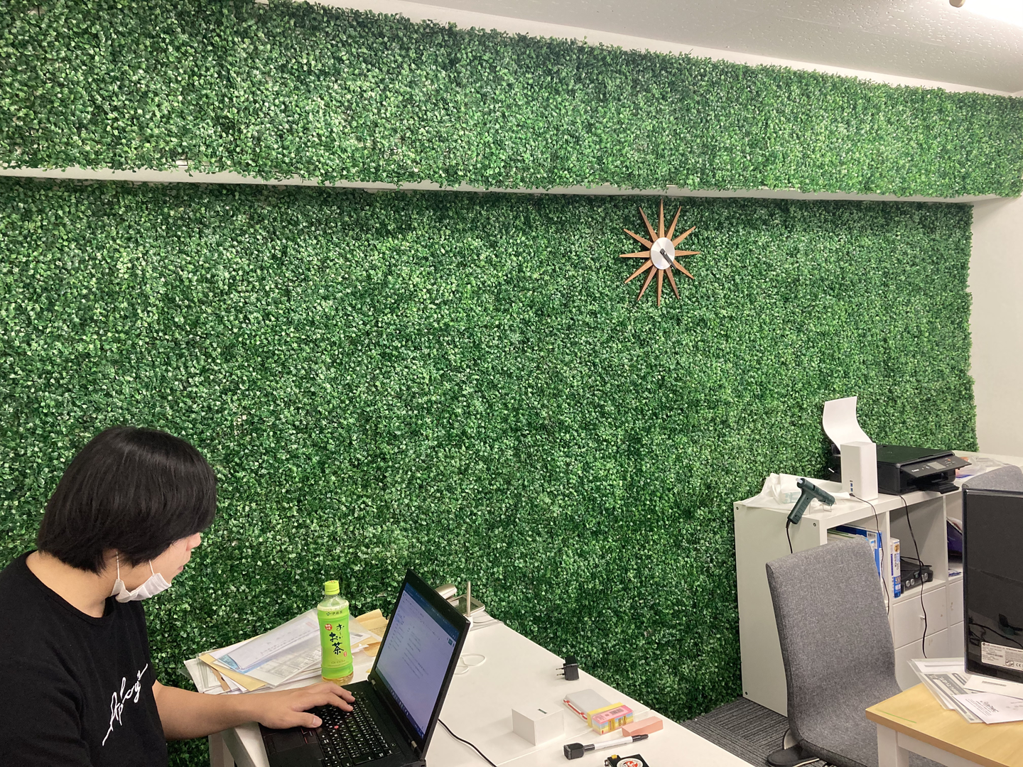 社長や以前のブログに登場した営業担当の光畑さんの意向で「IT企業っぽくしたい」と方向性が決まったようなので壁に森を貼ってます。(これから観葉植物なども増える予定だそうです)
