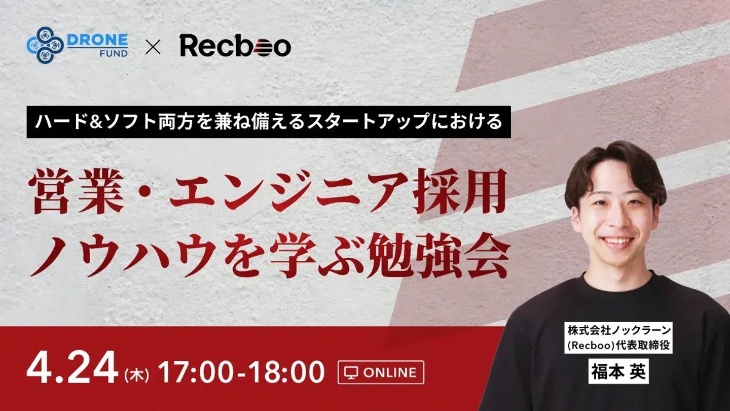 スタートアップ企業の中途採用を支援する採用コンサルティング・代行サービス『Recboo(リクブー)』を運営する株式会社ノックラーン(東京都大田区、代表取締役:福本 英)は、2025年4月24日に提携VCであるDRONE FUND株式会社の投資先スタートアップ企業を対象とした「ハード&ソフト両面を担うスタートアップにおける営業・エンジニア採用ノウハウを学ぶ勉強会」を開催しました。