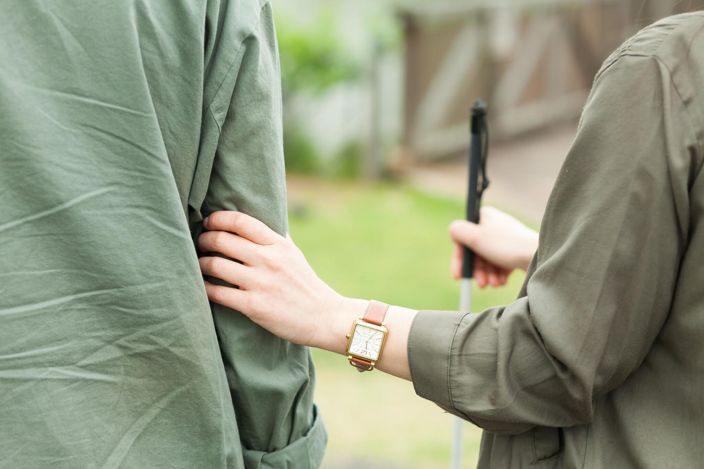 視覚障害者は、急に手や白杖を引っ張られたり、背中を押されたりして誘導されると何が起こっているのか把握することが難しく、怖い思いをします。誘導するときは、声をかけてから肩やひじを掴んでもらうようにしましょう。