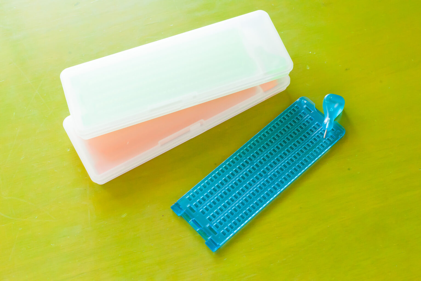 小型点字器。長方形の点字器に、紙をはさんで針で点字を打つ