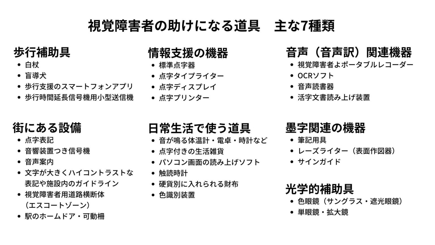 白杖や盲導犬、点字など、視覚障害者の生活の助けになる道具や機器にはさまざまな種類があります。分類すると、主に以下の7種類です。