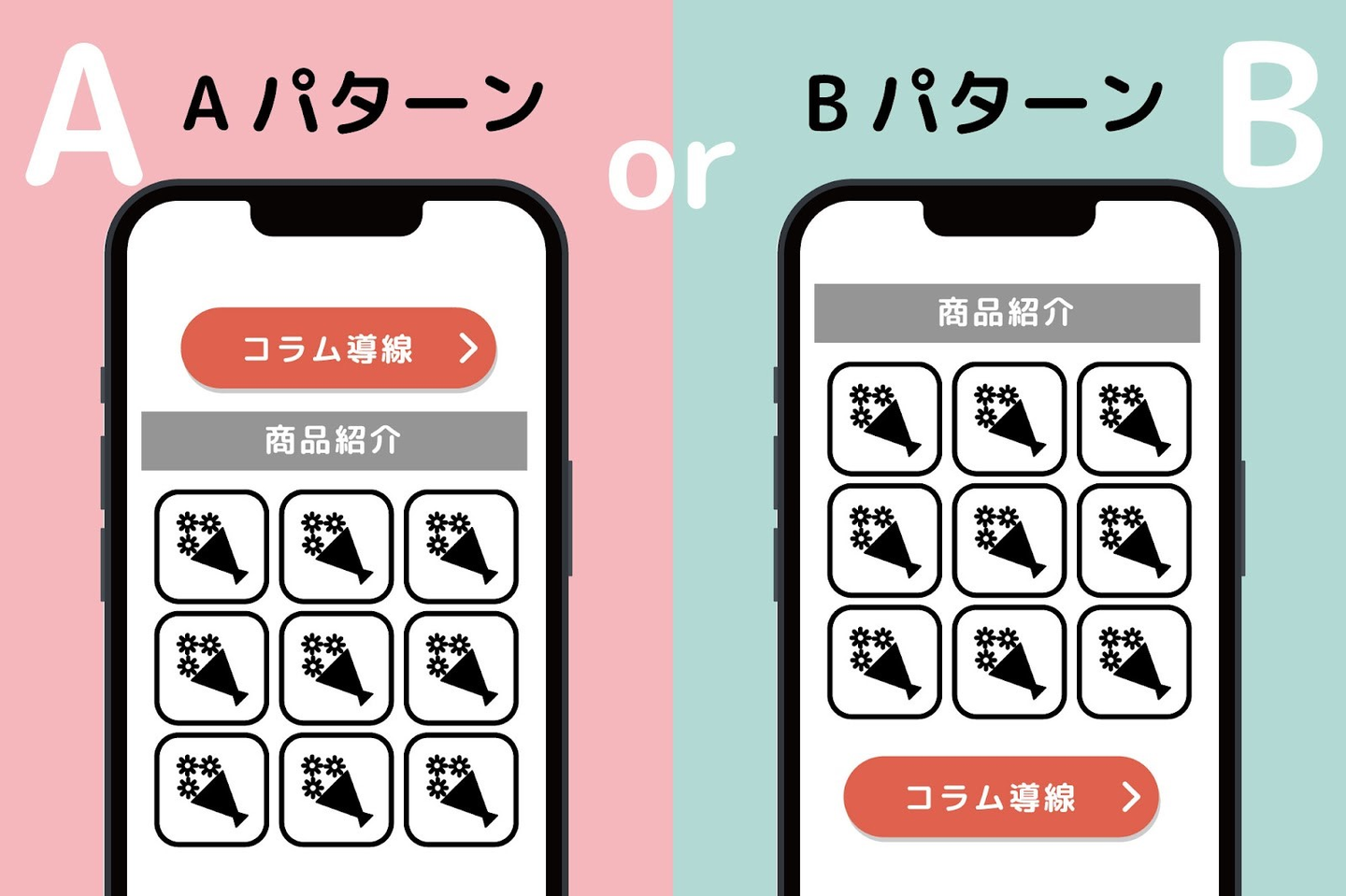 例えば、販売ページからコラムページの導線を付ける位置はどこが最適なのかをテストする場合をご紹介します。
