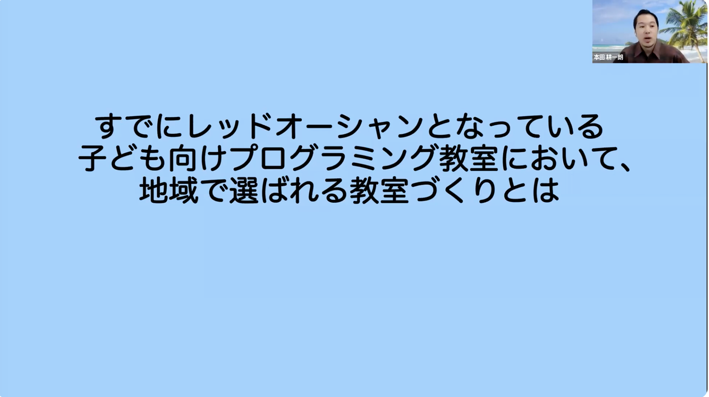 当日は僭越ながら、「すでにレッドオーシャンとなっている子ども向けプログラミング教室において、地域で選ばれる教室づくりとは」という内容で、