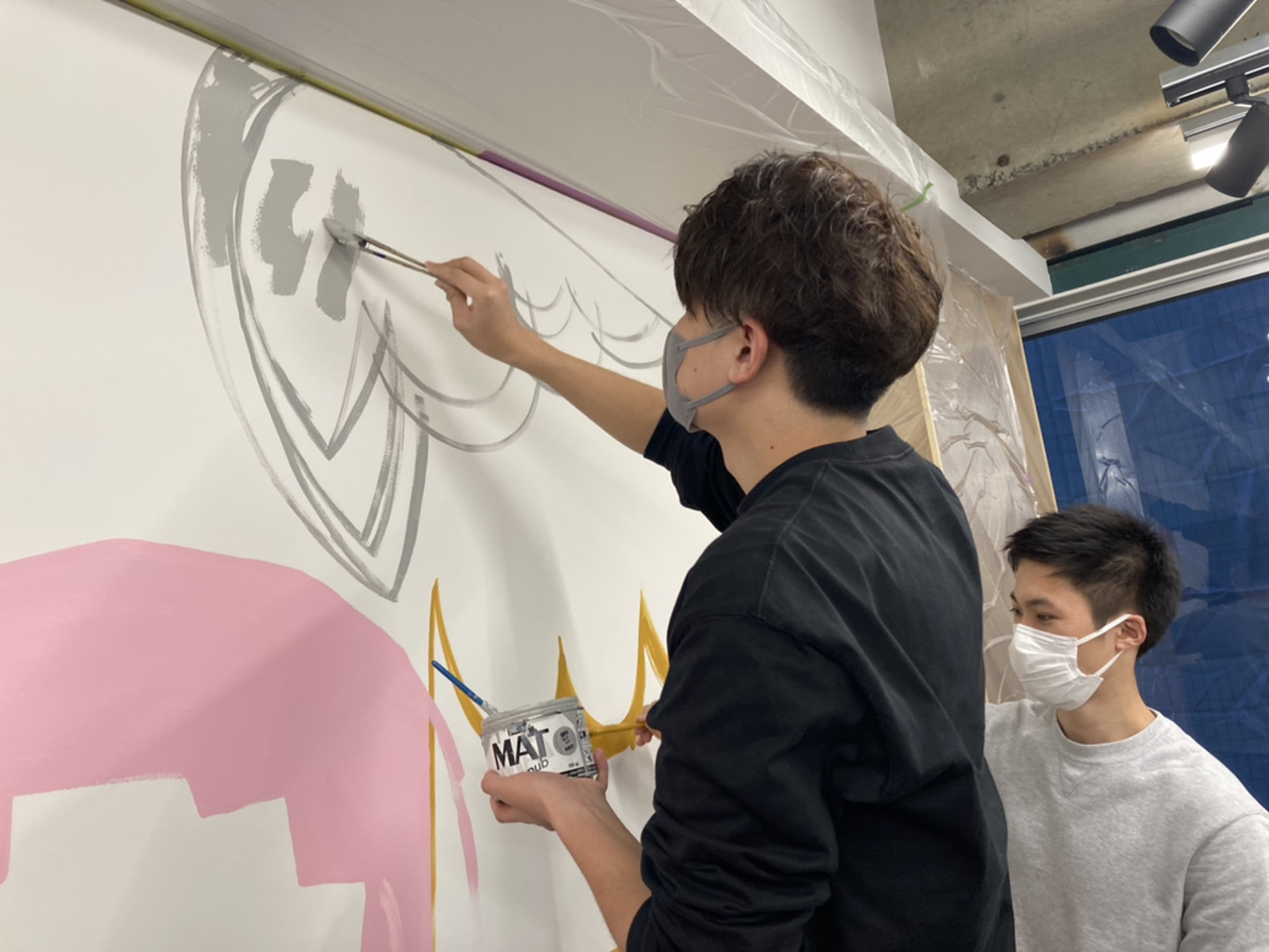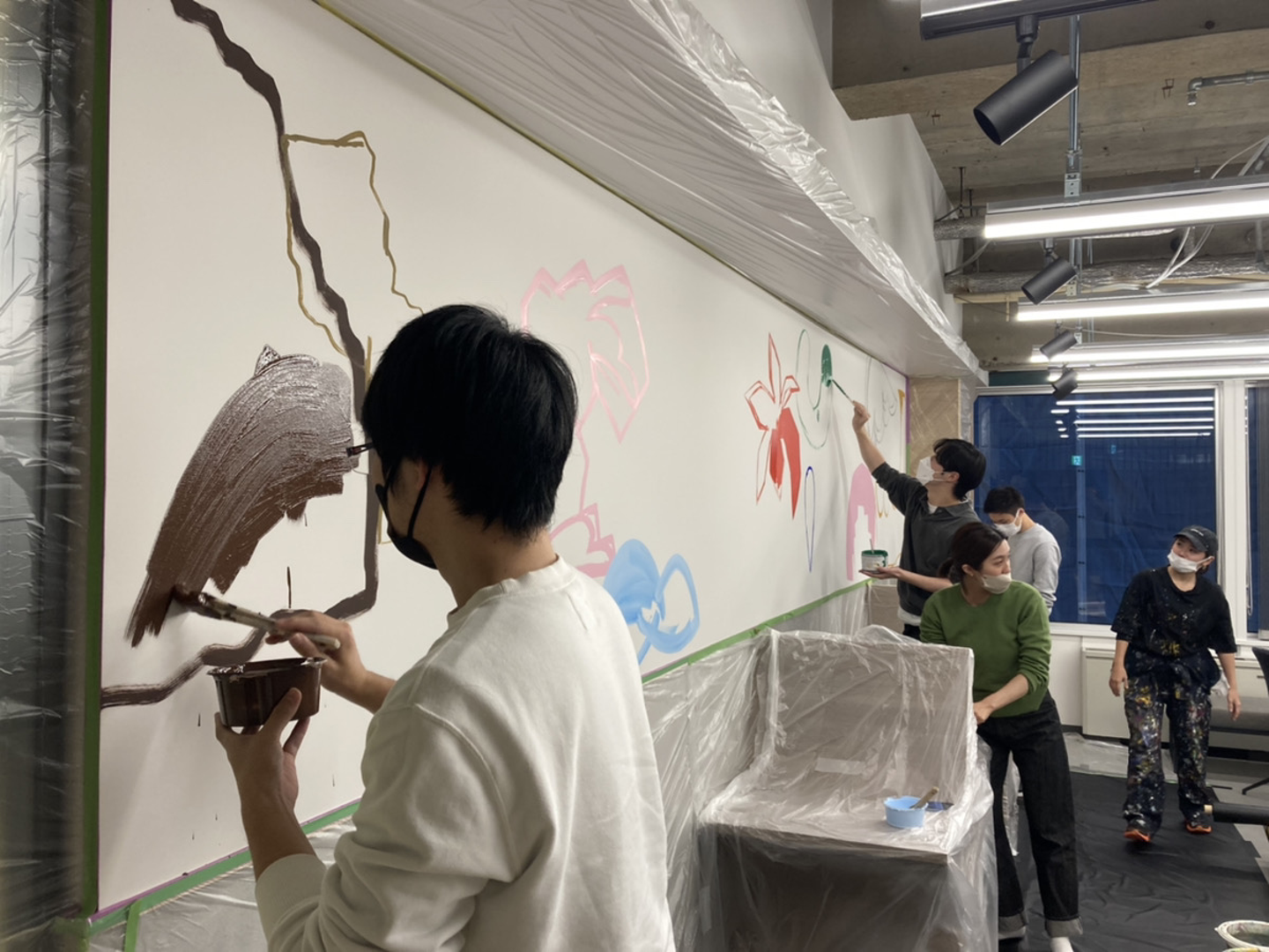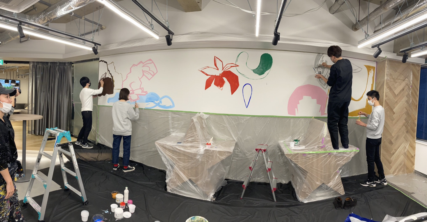 実際オフィスの壁にアートする際はアーティストさんと一緒に社員もペンキ塗り、