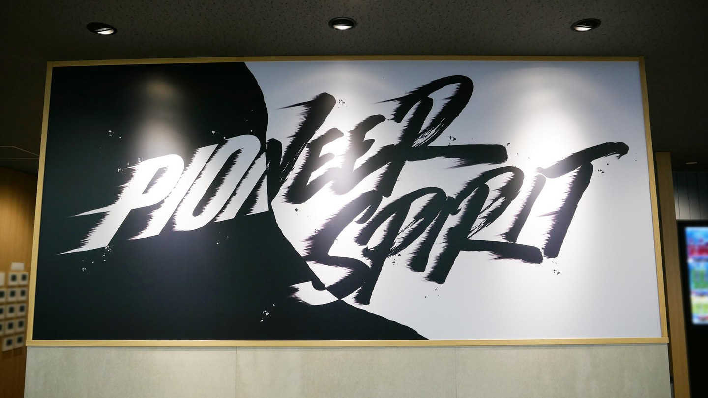 左から右へ、開拓者精神のイメージを「力強い意思」を込めて描いており、フォントも左と右で変化させています。