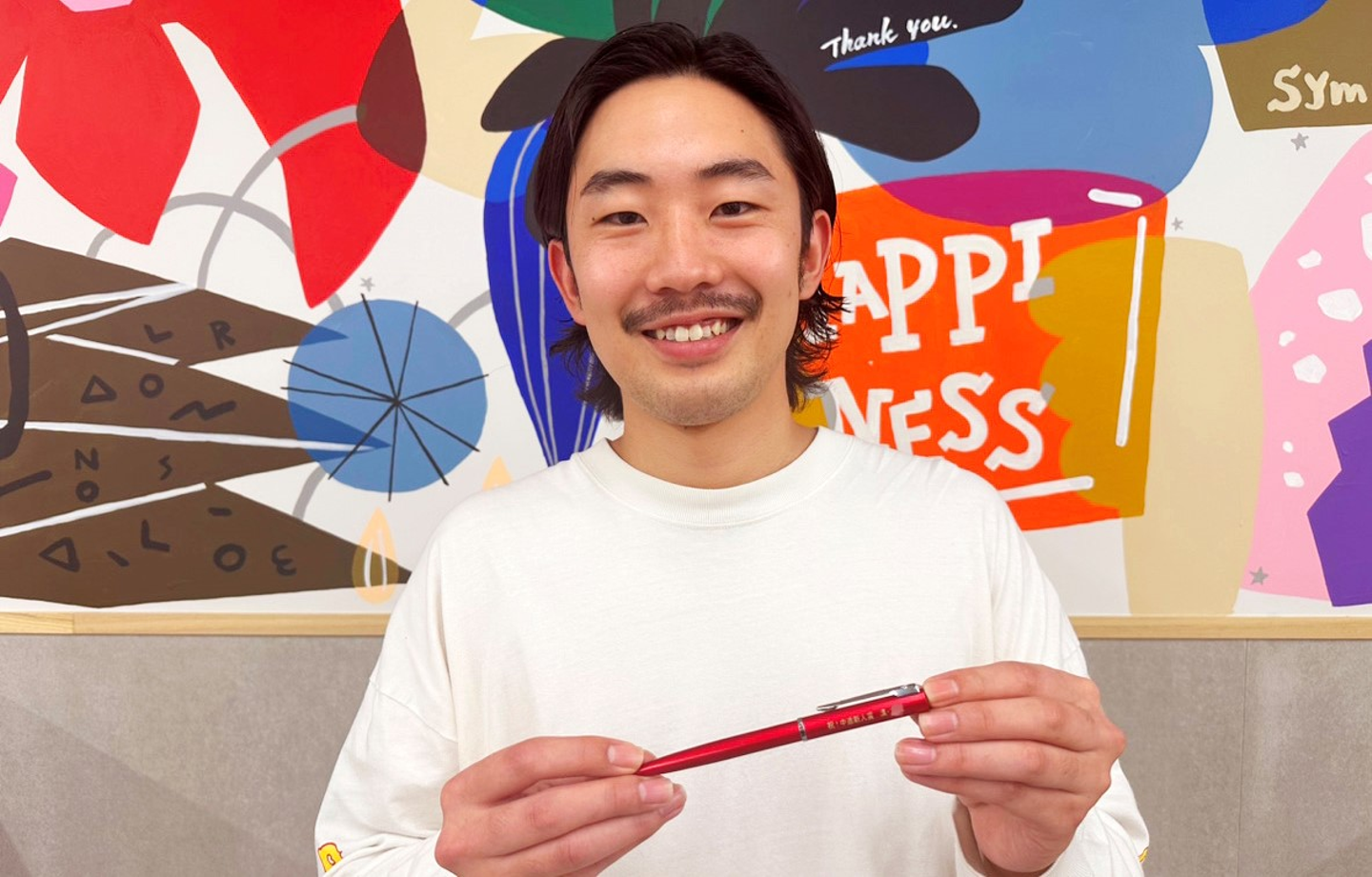 (クライアントから贈っていただいたボールペン!Fさん嬉しそうですね!)