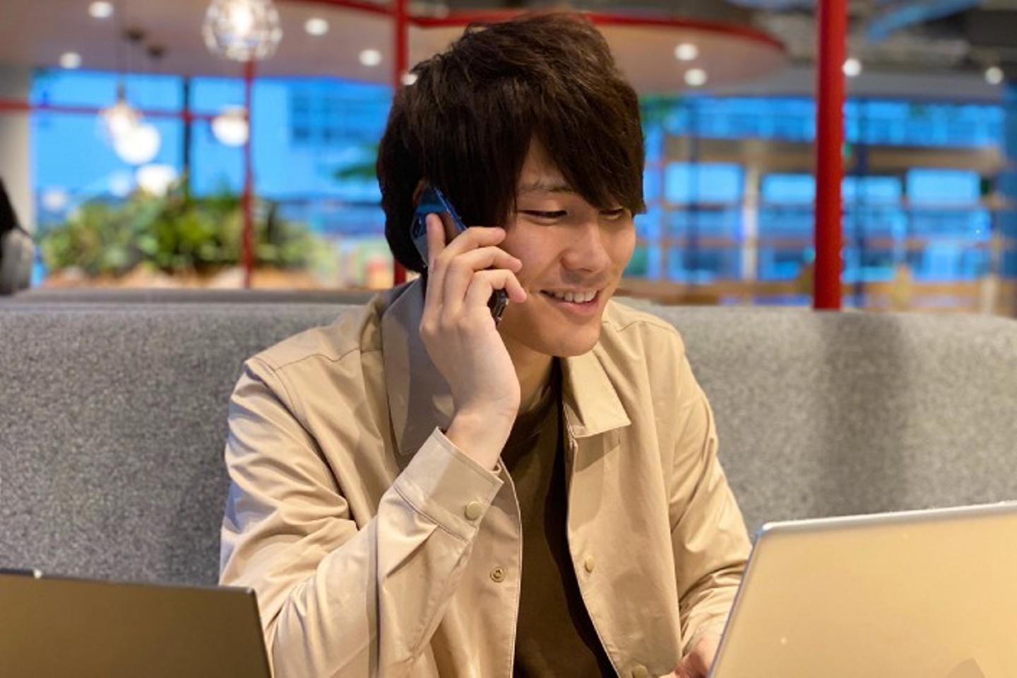 インタビューを前に田住の印象を周りに聞くと、モデルさんのようという声が多く、どんな話が聞けるのかと楽しみにしていた。はっと目を引く存在感は確かにモデルさんのようだが、話始めるとその姿勢と言葉の端々に本来持っている実直さと熱意が伝わってくる。プログラミングの知識をもった上での入職は文系も多い同期の中では強みだったが、ここからは「コミュニケーション」がキーになる。お客様との対話の中で、相手目線で話を聞きだすスキルは、日々先輩に学び、盗み、真似することで徐々に身についていくもの。今がまさに成長期だ。