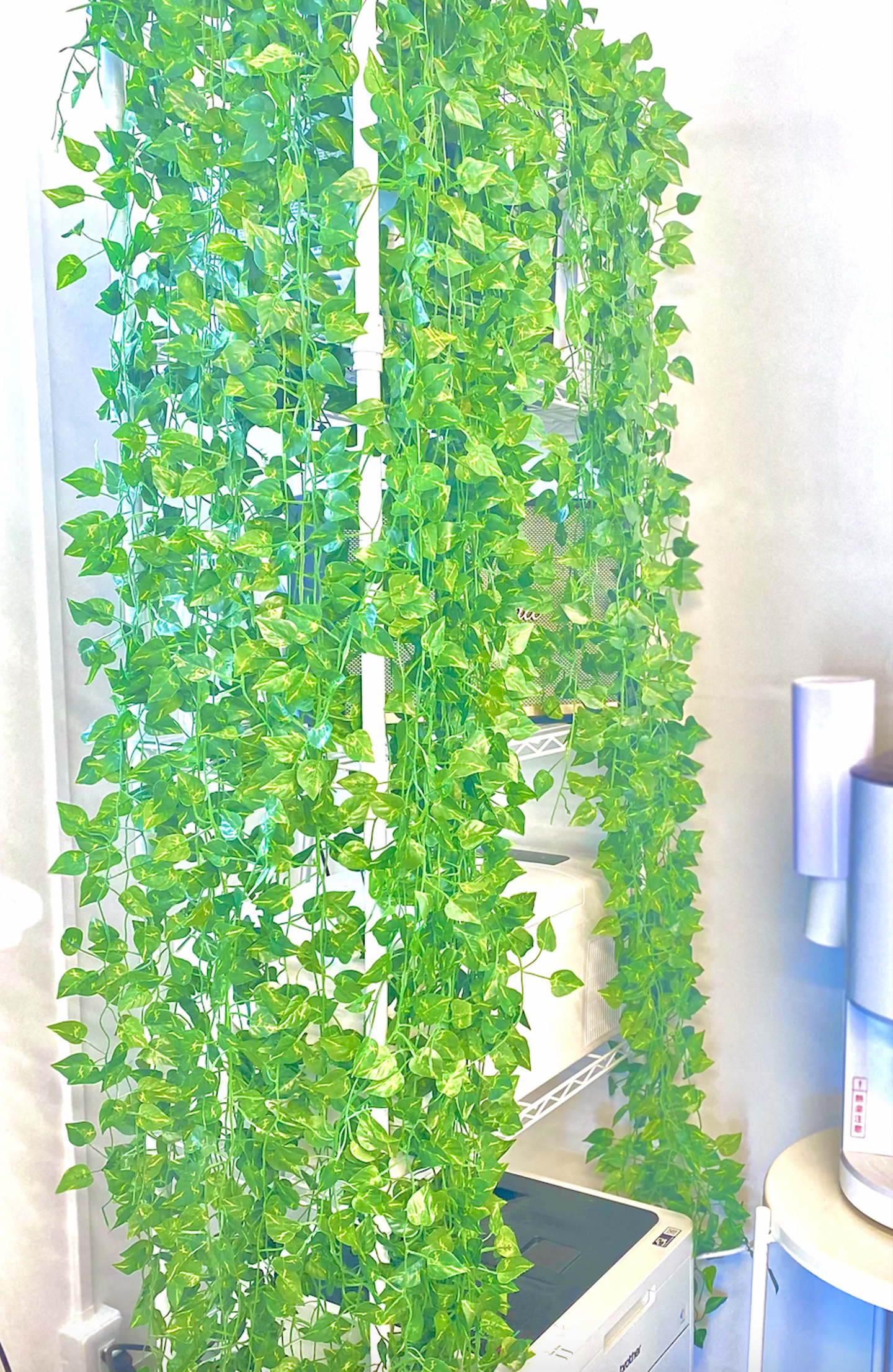 観葉植物をカーテンにして、これらを隠しています。普段は何が置いてあるのか気が付きません。「ごちゃごちゃ」しないので、オフィスにより統一感を与えてくれます。