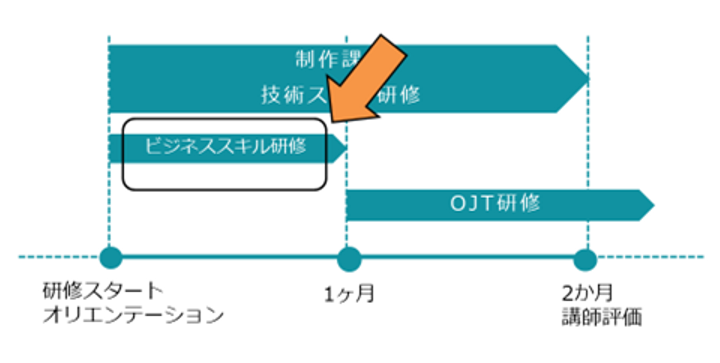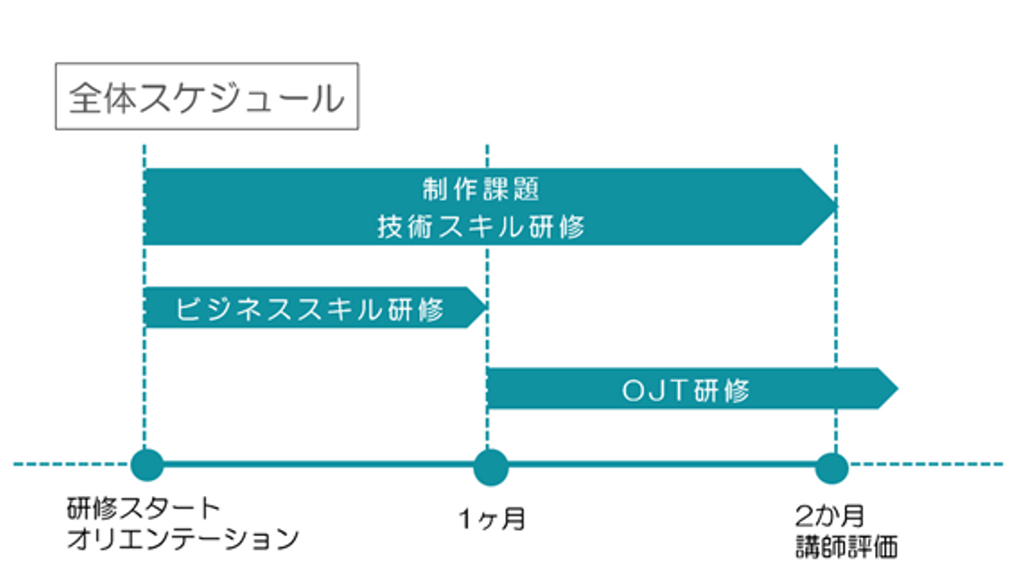 ざっくりとしたイメージは図の通りになります。約2ヵ月間の研修期間の中で、①ビジネススキル研修、②技術スキル研修、③制作課題、④OJT研修に取り組んでもらっています。