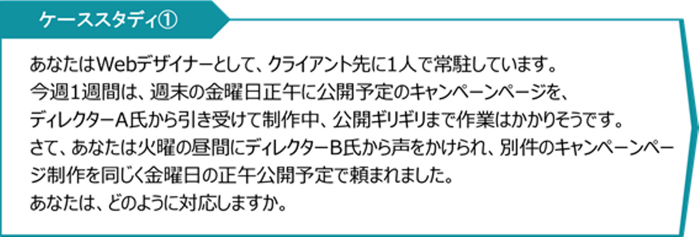 対応が、①~③どれかによって、このあとの対応は変わってくると思います。さらにいえば、「A氏とB氏の案件はどちちの優先度が高いのか?」「公開予定日の変更はできるのか?」など、実際の制作現場に落とし込むと、想定すべきことはまだまだあると思います。