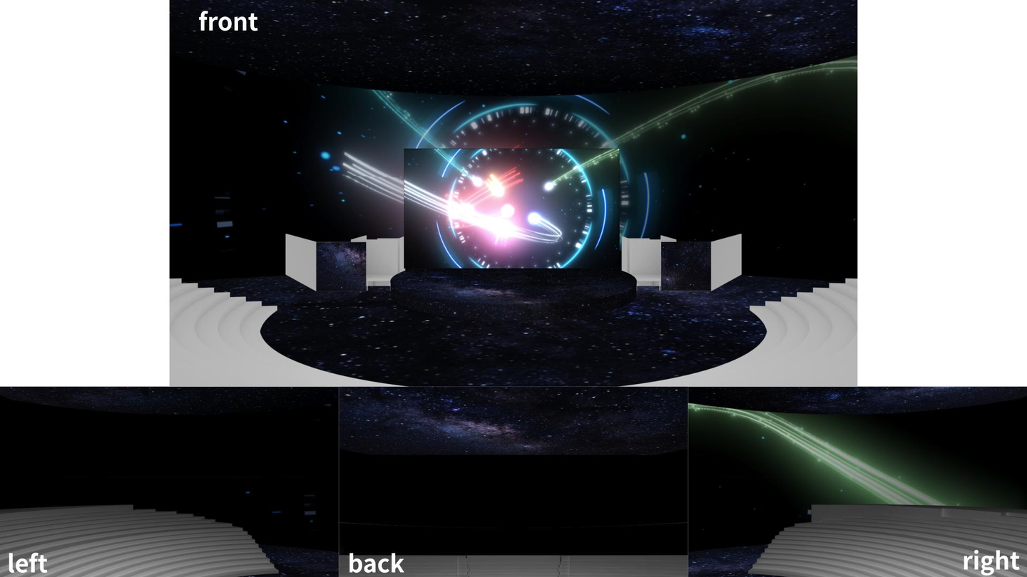 メインスクリーンと後方円形スクリーンは別々に映像が流れるため、「空間全体としての一体感」をどう作るかが大きな課題でした。