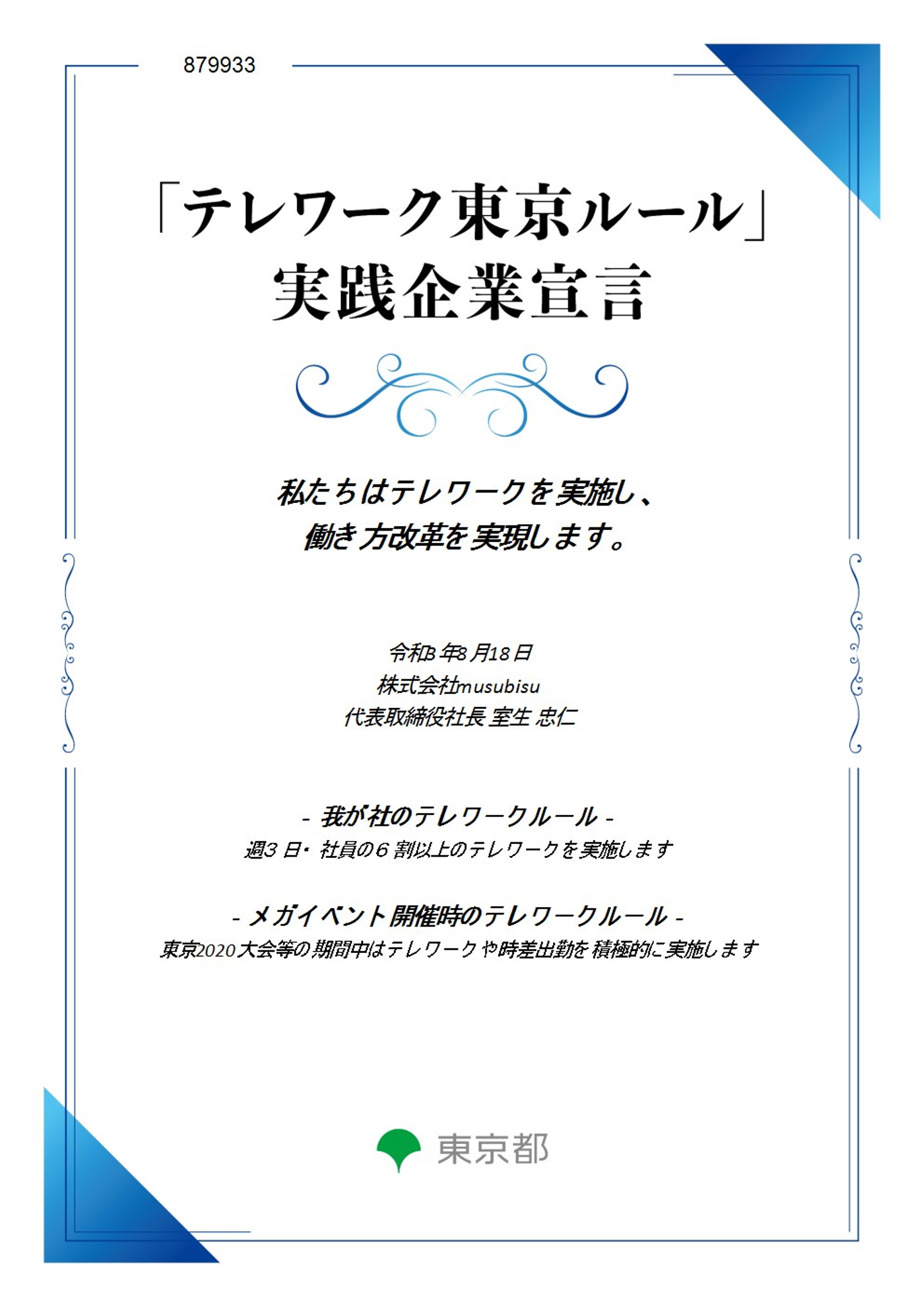 musubisuは社員一人一人が柔軟に仕事ができるよう、テレワークを新型コロナウイルス感染症防止のための緊急避難的な一過性のものとすることなく、促進・定着に向けて、東京都産業労働局が実施している「テレワーク東京ルール」実践企業宣言に登録致しました。