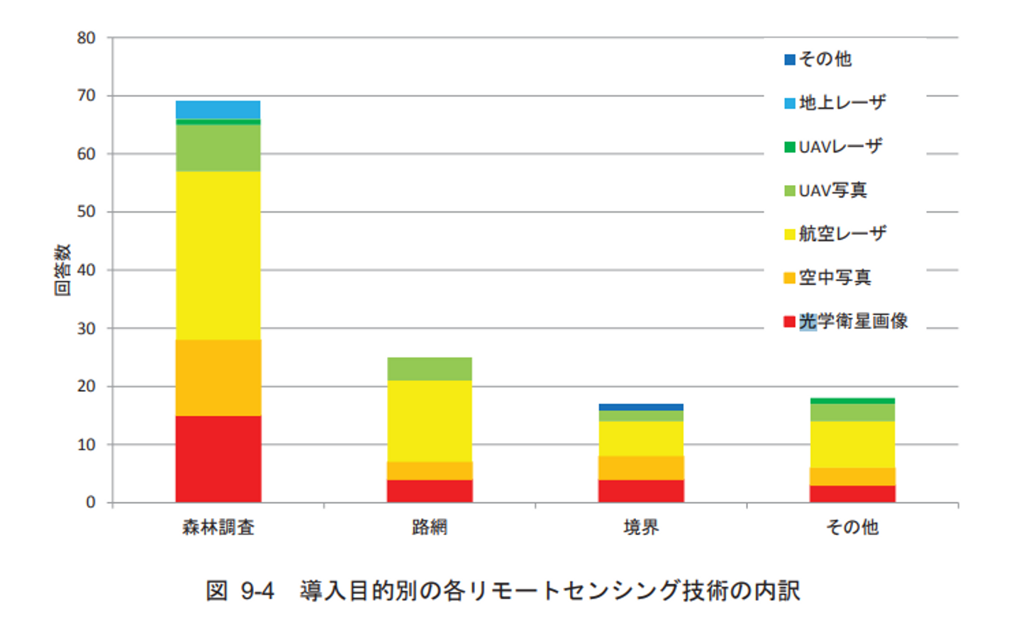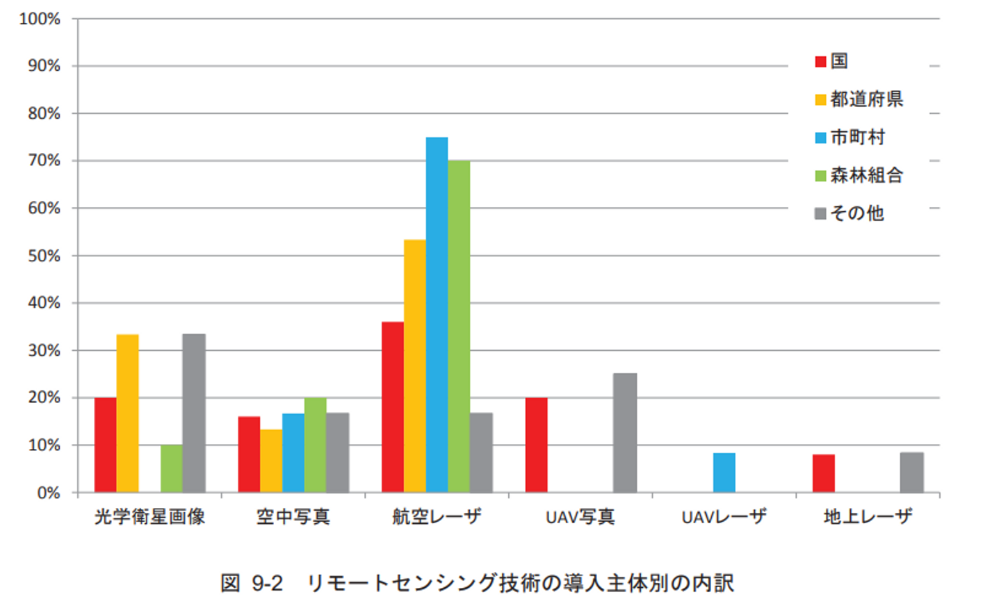 林野庁が2018年3月に報告した資料によると、最も多く利用されているリモートセンシングの技術は航空レーザで、市町村や森林組合などで利用されていることが多いです。