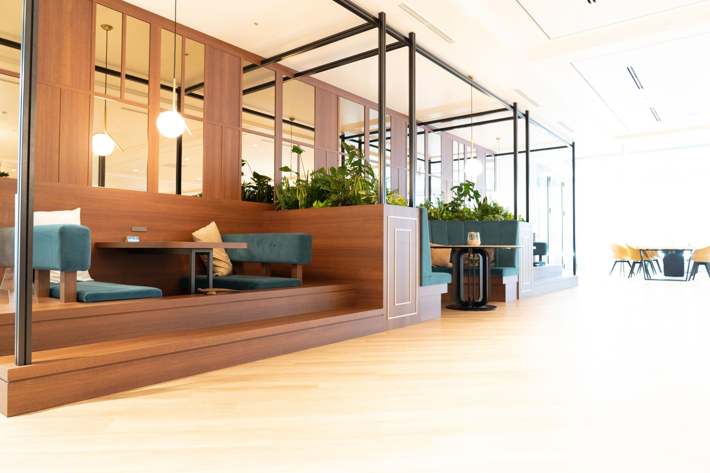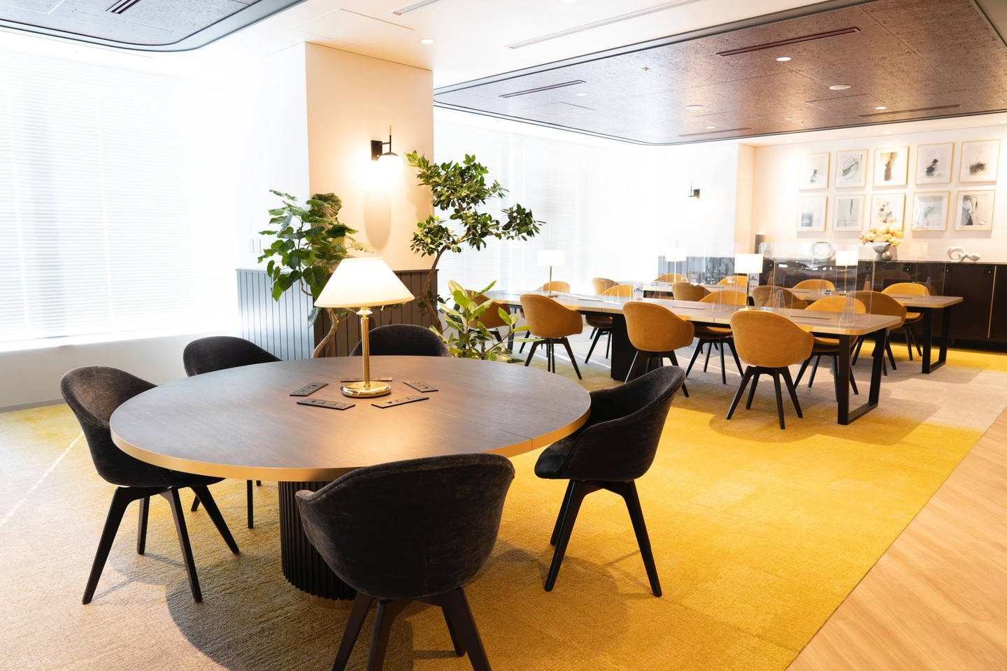 ▲チームミーティングに便利な長方形の大きなテーブルや壁際のソファベンチ席、二人掛けテーブルなど様々な種類の席が設置されています✨
