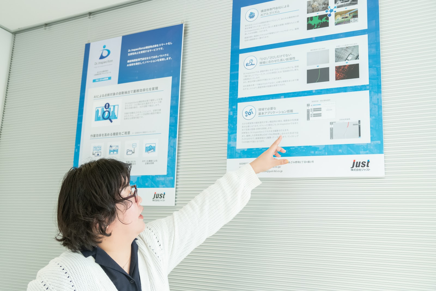 15年働いたIT企業を辞め、2019年7月にジャストに中途入社した楠佳代子さんは、イノベーション企画部唯一のUI/UXデザイナー。建物調査の負を100%解消するアプリ『タテログ』やAIを用いて構造物を診断する『Dr.Inspection』などのプロダクト開発のほか、自社HPの更新や印刷物制作などの業務に携わっています。