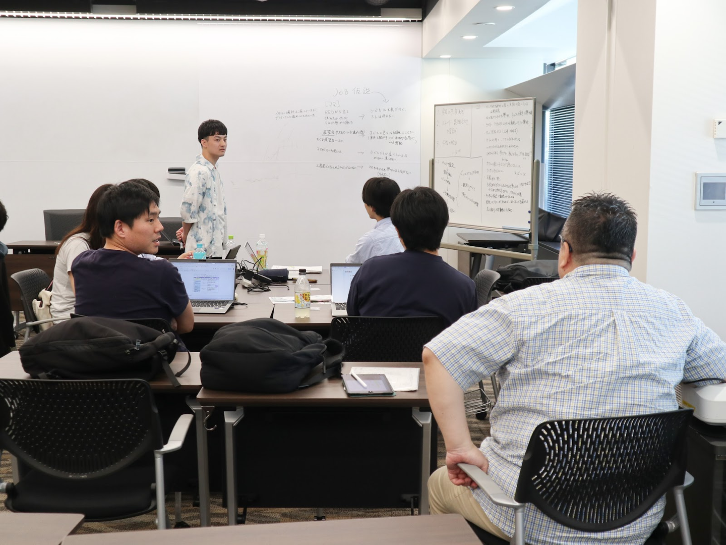 江藤さん 問題解決研修です。グループに分かれ、ある企業の収益改善策を考える研修でした。初めのうちは、事前の認識あわせが不十分なまま作業を進めたので資料がばらばらになるなど苦労しました。事前のすり合わせの重要性だったり、、役割分担の大切さも学びましたね。