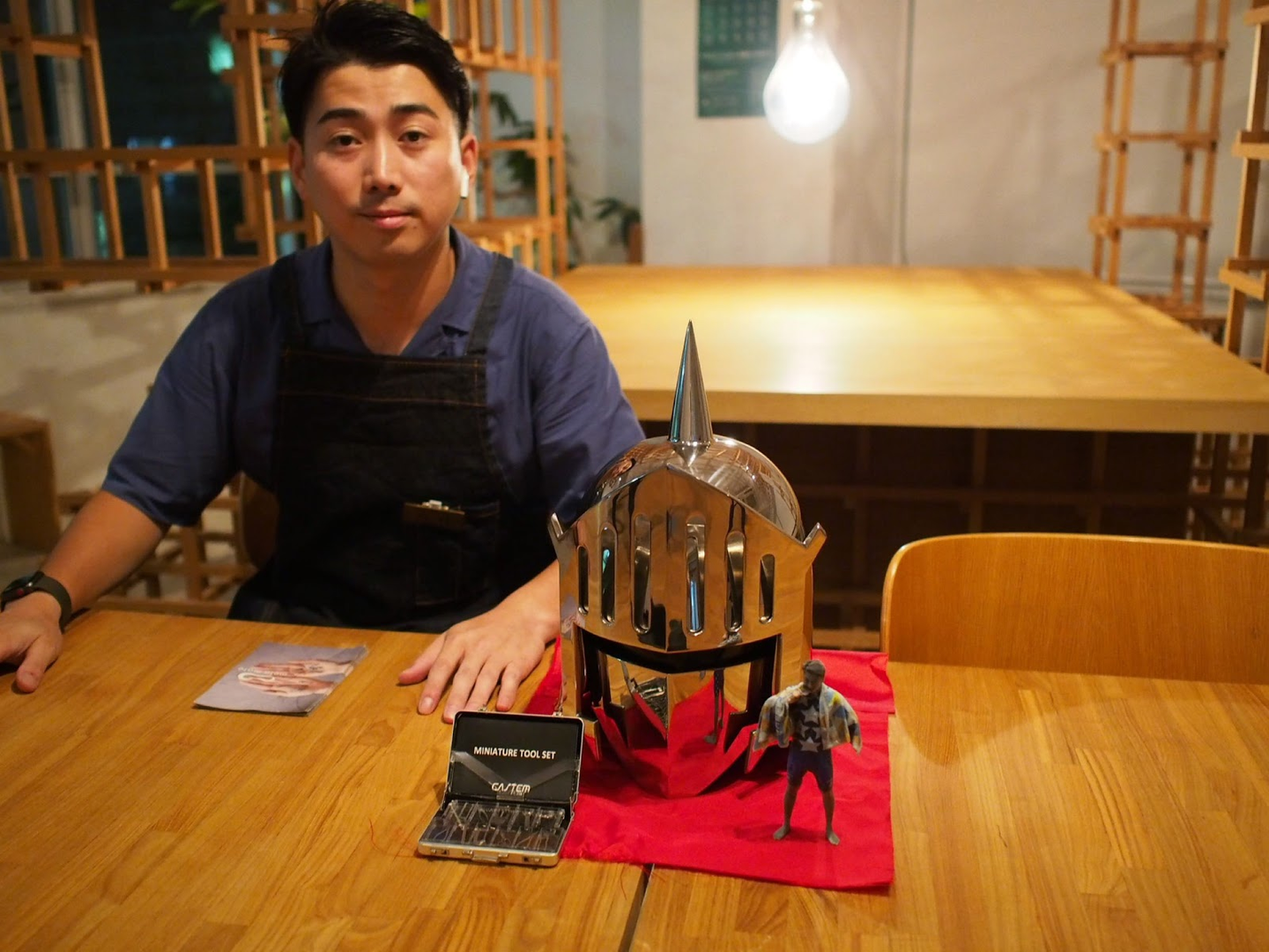 開始前に心を落ち着かせている戸田とロビンマスクとミニチュア戸田とミニチュア工具。