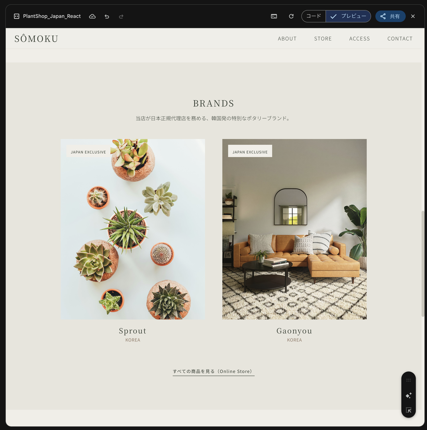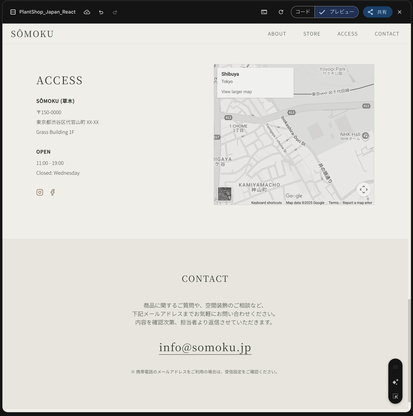 日本で営業している植物屋のHPを作成してください。カラーはアースカラーをベースに3色までにしてください。セクションは、TOP、about、オンラインストアへの導線、お問い合わせ、営業時間、マップの構成で、下層ページなしのシングルページで作成してください。余白を意識し、モダンなデザインで最小限の情報で構成してください。