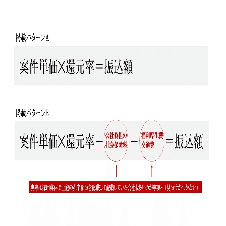 当時、所属していた都内の高還元SESの還元率は「会社負担分の社会保険料」は本来は会社が従業員の社会保険料を負担分して国に支払うものを、給与から差し引く計算方式でした。ただ、この計算方式でも給与が高くなる高還元SES会社もあるようです!