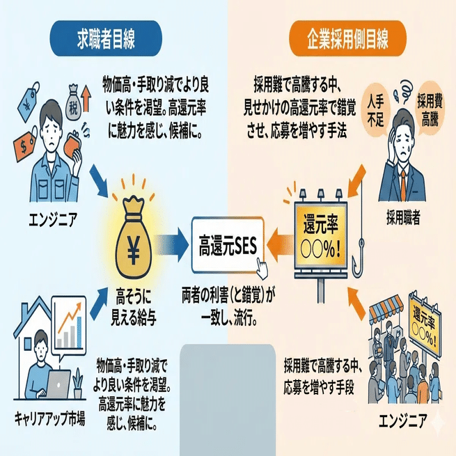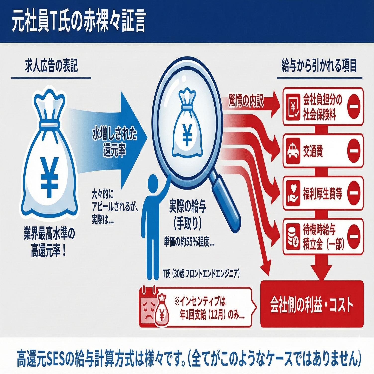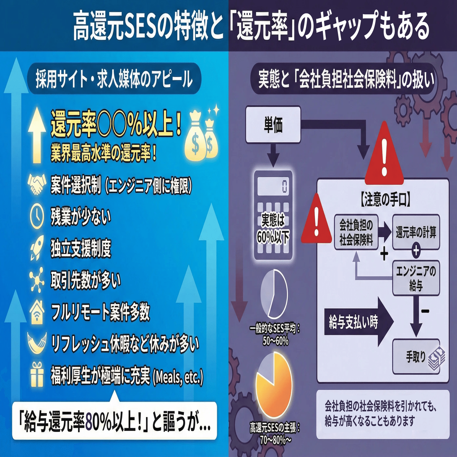 「還元率◯◯%」と聞いて「その還元率の額の給与がそのままもらえるの?」と本当に思えますか?一方で高還元SES に勤めるITエンジニアの方々は「実際は当初の還元率に比べて⼿取りが少なかった」という経験はありませんか︖