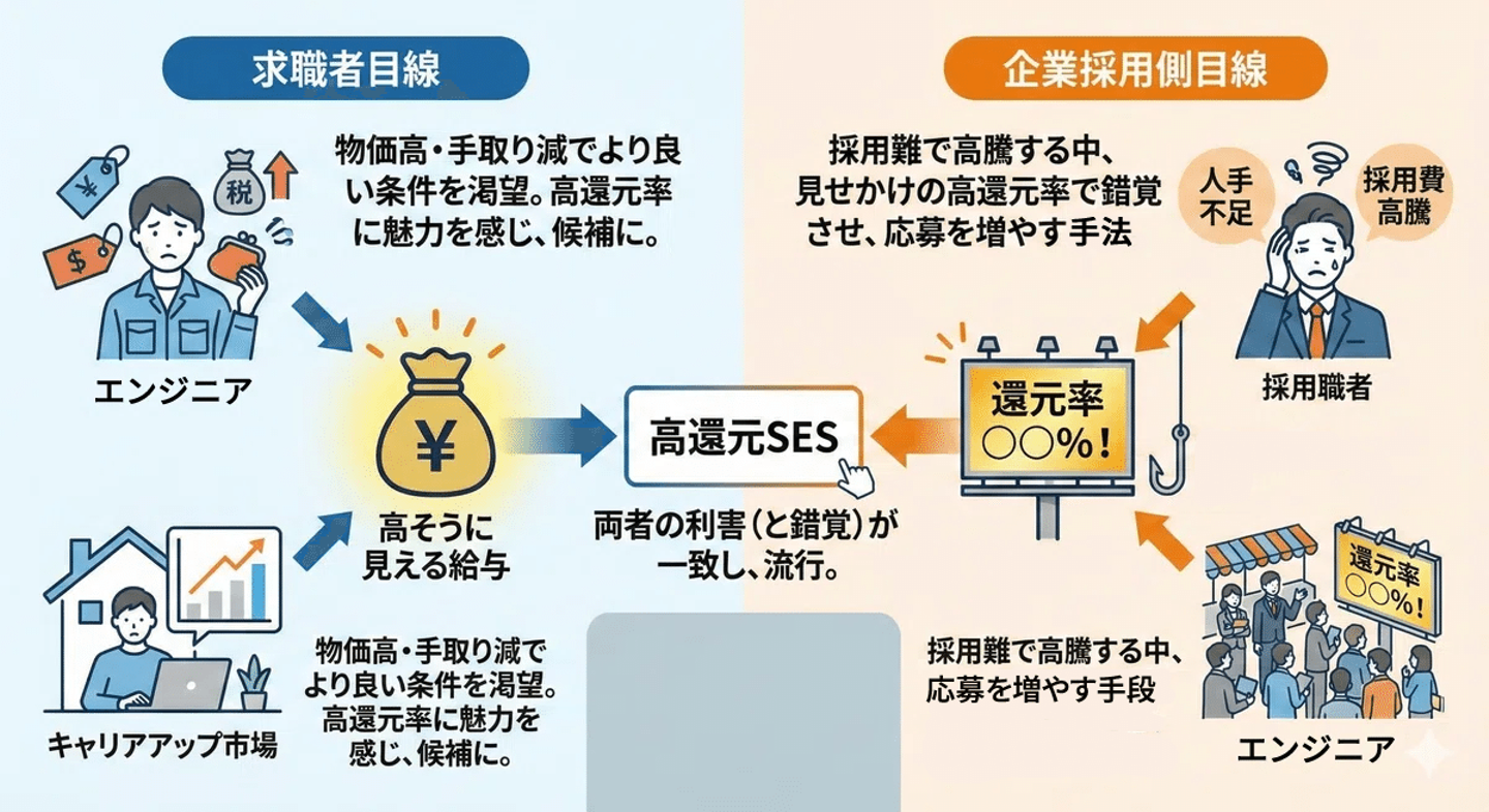 現在のSES市場は慢性的な人手不足状態です。また、在宅勤務やリモートワークが普及したため、エンジニアの働き方が大きく変わっており、キャリアアップに適した市場です。一方で物価高騰や社会保険アップなどの要因で可処分所得(手取り)が減っています。このため、求職者はより条件の良い(高い給与)を求める傾向にあります。高還元SESでは還元率が高く、給与が大幅にアップするように見えるため高還元SESを転職先の候補にしている方々が増えています。