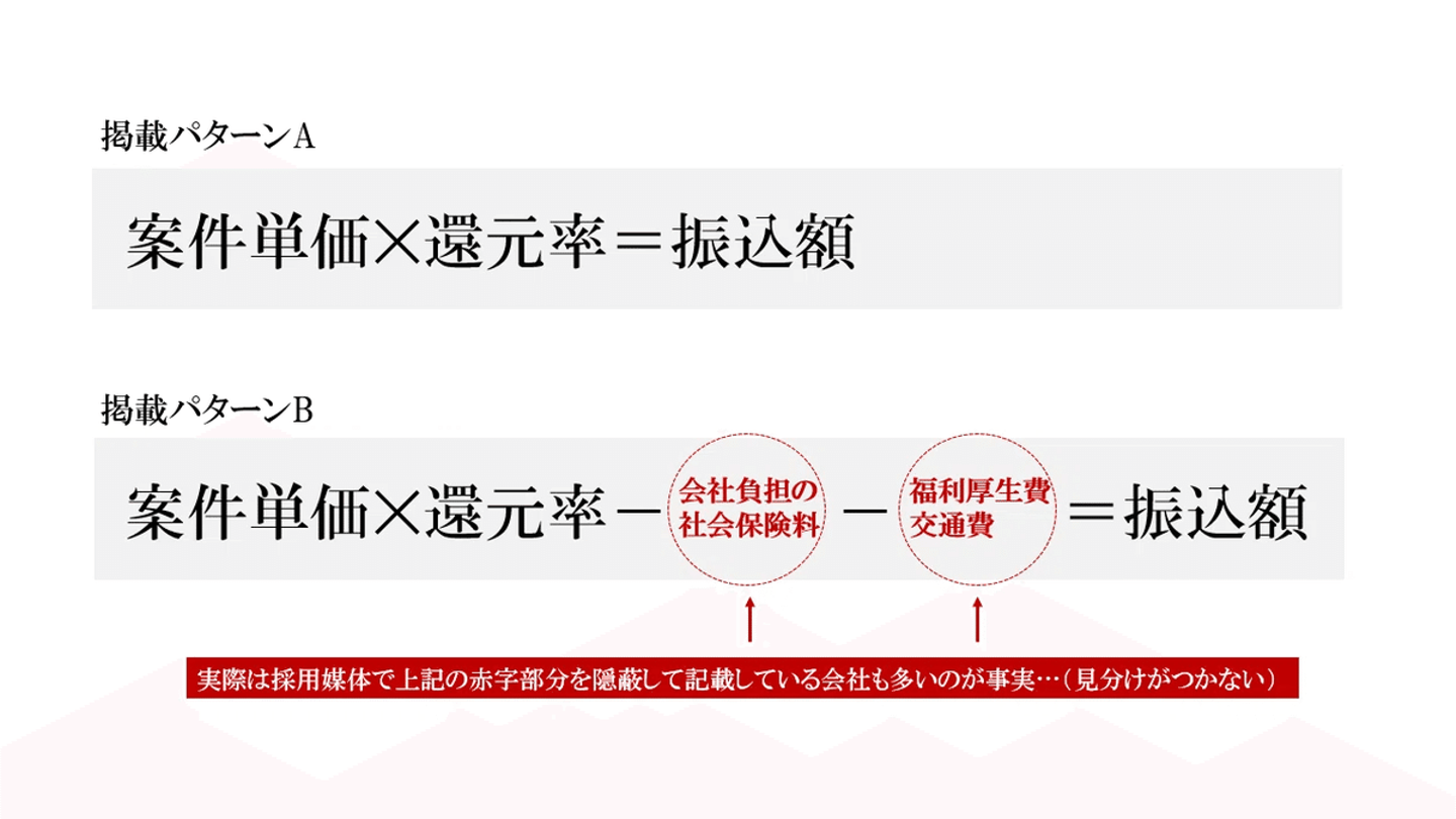 本記事内で表記されている高還元SES企業の給与計算式は全ての高還元SES企業が同じとは限りません。企業により独自の様々な計算方法がありますので、応募時や面談時に詳しく確認することをお勧めします。