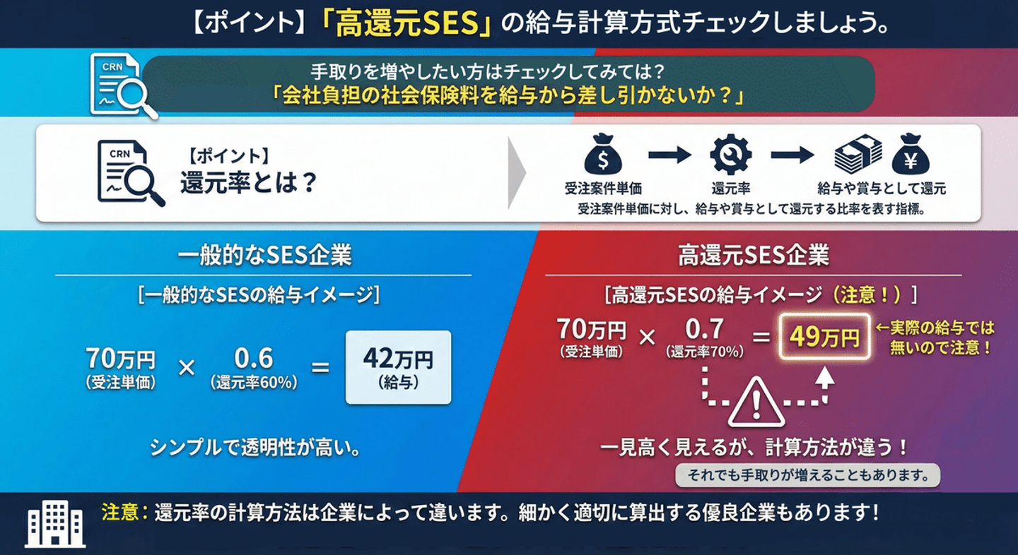 もちろんこの計算方式でも給与が高くなる高還元SES会社もあります!