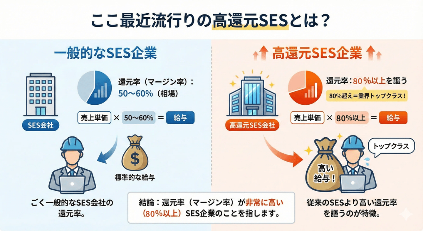 高還元SESとは名の通り還元率(マージン率)が高いSES企業のことを指します。ごく一般的なSES会社の還元率は案件単価の50~60%が相場と言われています。