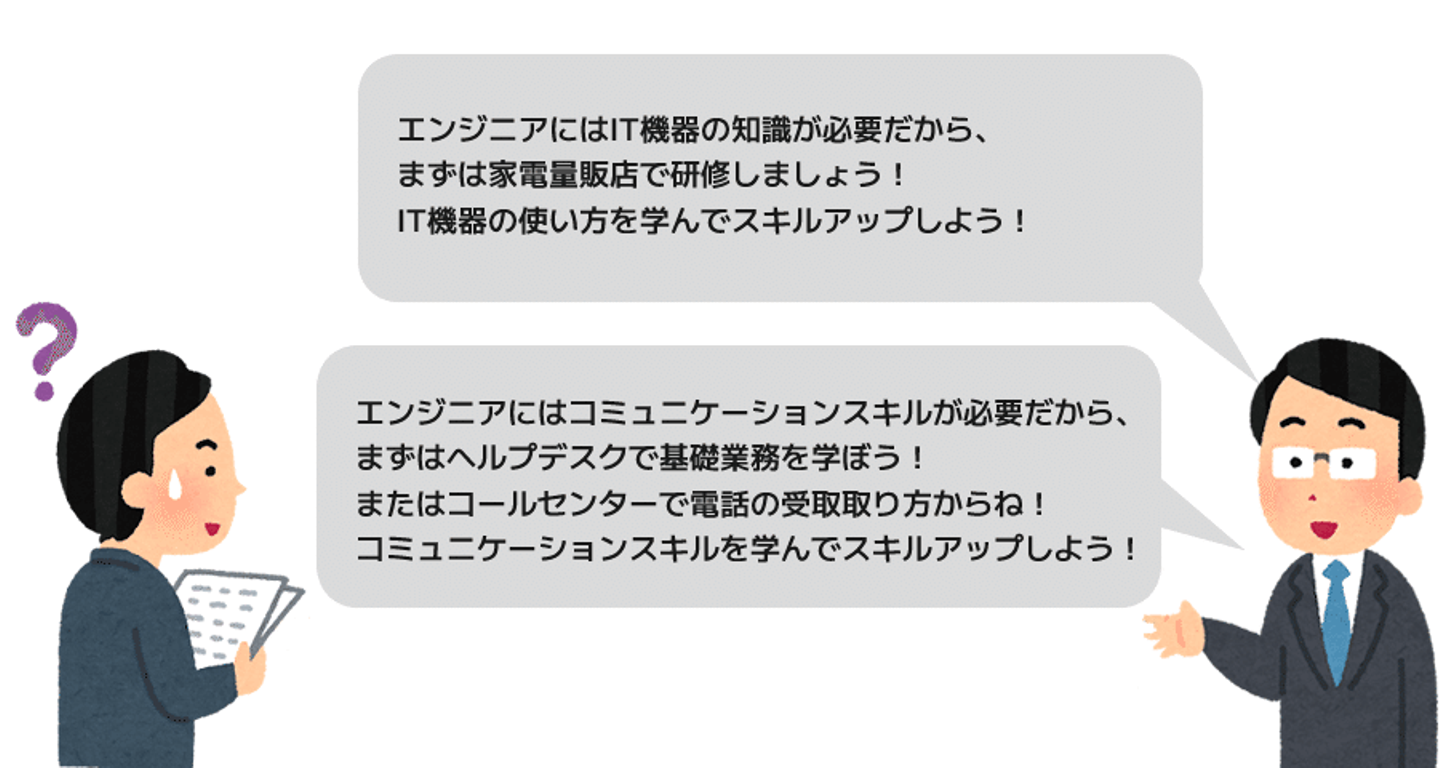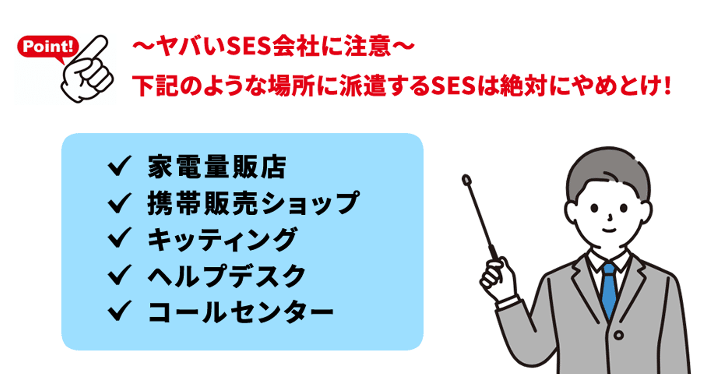 一部のヤバいSES企業は、エンジニアとしての成長を軽視し、短期的な収益を優先する傾向があります。このようなSES企業は、未経験者を家電量販店や携帯ショップ(あとはキッティング作業やヘルプデスクやコールセンターとか)に派遣することで、人件費を抑え、すぐに収益を得ようとする場合があります。しかし、このような派遣は、ITエンジニアのスキルアップには繋がらなく、将来的なキャリア形成にも悪影響を及ぼす可能性があります。貴重な時間を無駄にしないで!