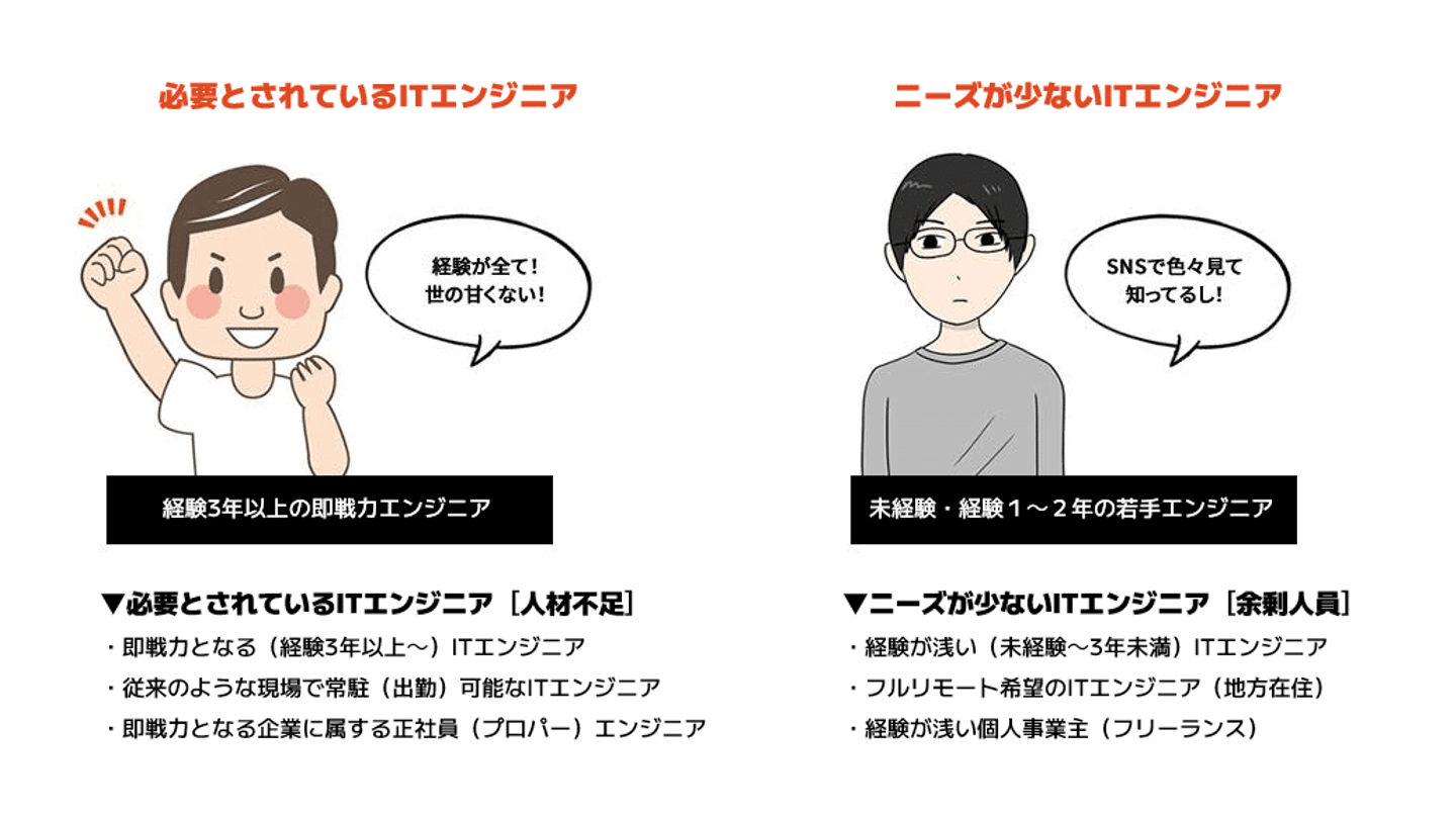 ITエンジニアの人手不足は深刻な問題ですが、それは「経験(3年以上~)があり常駐可能な即戦力のエンジニア」に限っての話です。「経験が浅く(2年以下)フルリモート希望のエンジニア」は余っています。毎日流れてくる数千件の案件情報・人材情報ではこのような状態でエンジニア人材余りが発生しており、経験浅のエンジニアは飽和状態と言って良いでしょう…