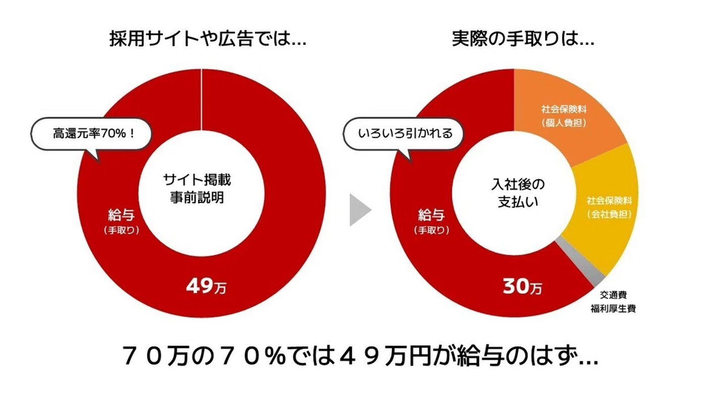 先ほども説明したとおり、ごく一般的なSES企業の還元率の平均は単価の50〜60%と言われております。それと比較して高還元SESの還元率は70%〜85%を謳っています。本来は会社が国に支払わなければならない「会社負担の社会保険料」を還元率に上乗せしてあたかも高還元のように見せかけ、いざ給与支払いの時にはエンジニアの給与から、それを差し引くという手口が高還元SESでは一般的になっています。つまり、ITエンジニアの採用時には還元率を高く見せて多くの応募を募るという手段です。
