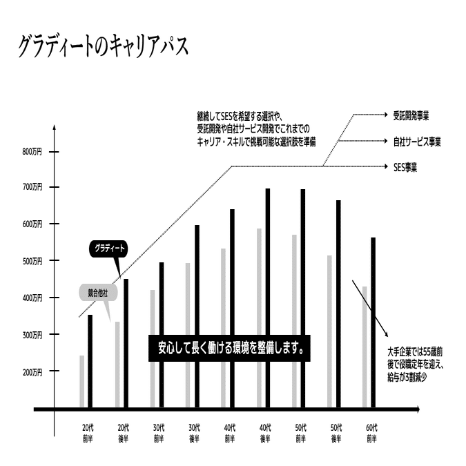グラディートでは、年齢を重ねても引き続きSESで働き続ける選択や、また受託開発や自社サービス開発でこれまでのキャリア・スキルを活かしてチャレンジ出来るよう選択肢を用意したいと思っています。